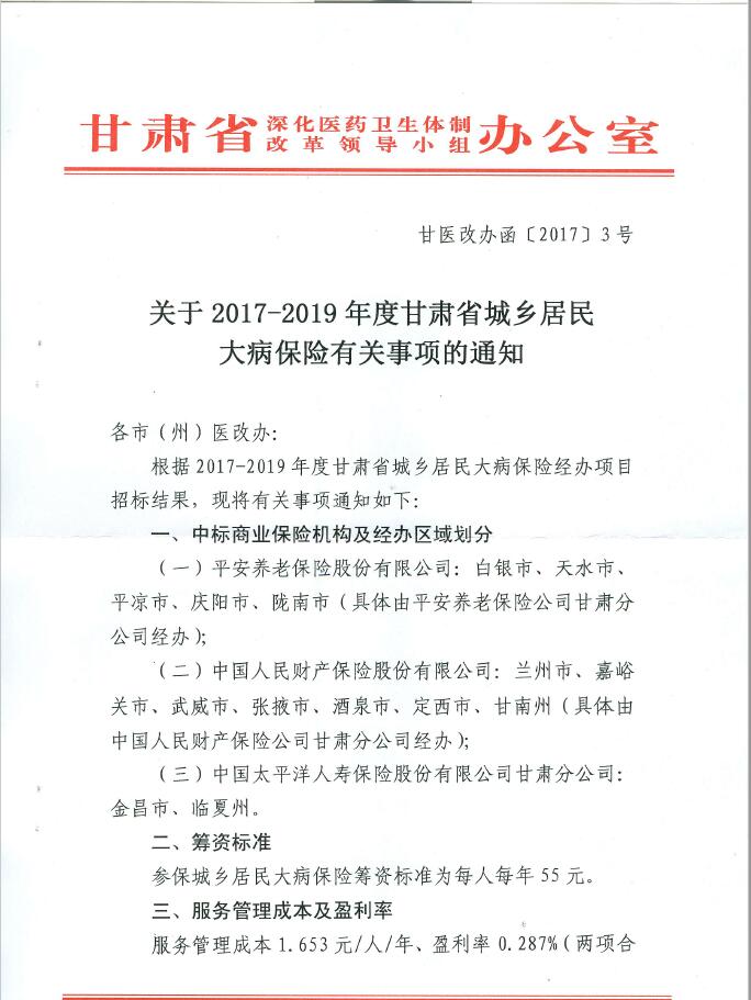 关于2017-2019年度甘肃省城乡居民大病保险有关事项的通知
