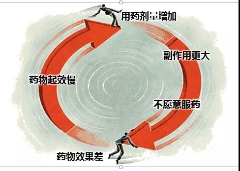 精神分裂症治疗是一场长跑比赛!和长跑一样,精神分裂症需要坚持不懈的治疗才能完成比赛。精神分类症治疗最少需要5-6年时间。大约只有五分之一的患者有可能停药,大部分患者需长期服药,半途而废导致疾病复发,半途而废的长跑,会导致疾病卷土重来。疾病的复发意味着治疗难度增加,药物起效慢,用药剂量增加,就像下面这个恶性循环圈一样!