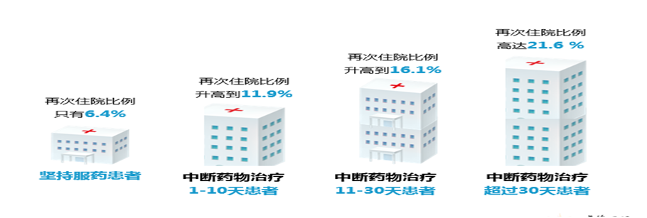 而中断药物时间越久,再次住院的几率越高!!!且看下面的数据!