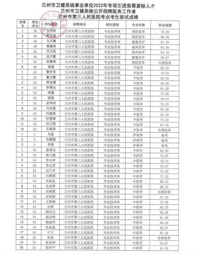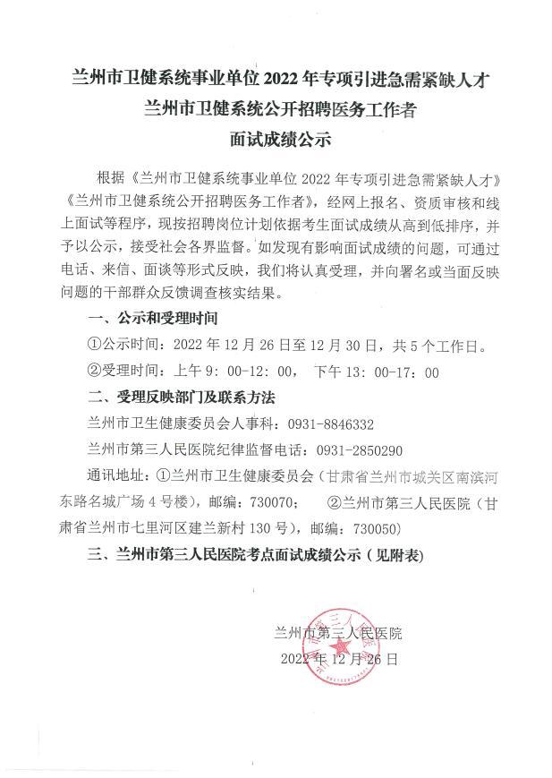 兰州市卫健系统事业单位2022年专项引进急需紧缺人才线上面试成绩公示