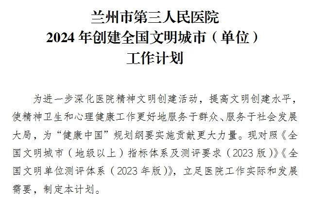 院党委高度重视全国文明单位创建,将其与医院各项重点工作同规划、同部署、同推进,制定印发《兰州市第三人民医院创建全国文明城市(单位)工作计划》,召开“兰州市第三人民医院创建全国文明城市(单位)推进会议”,对全院创建工作进行了安排部署。
