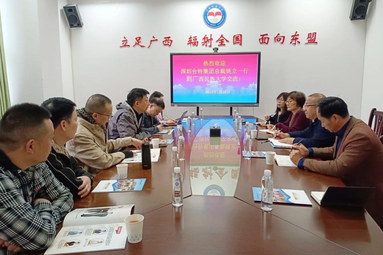 1月20日,深圳台铃集团总裁姚立一行到广西民族大学开展校企合作洽谈。学校党委常委、副校长姜明国出席并主持座谈会。东南亚语言文化学院党政负责人参加会议。
