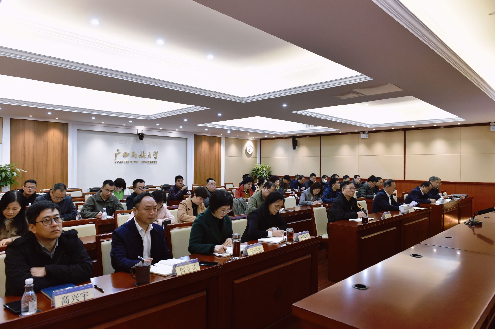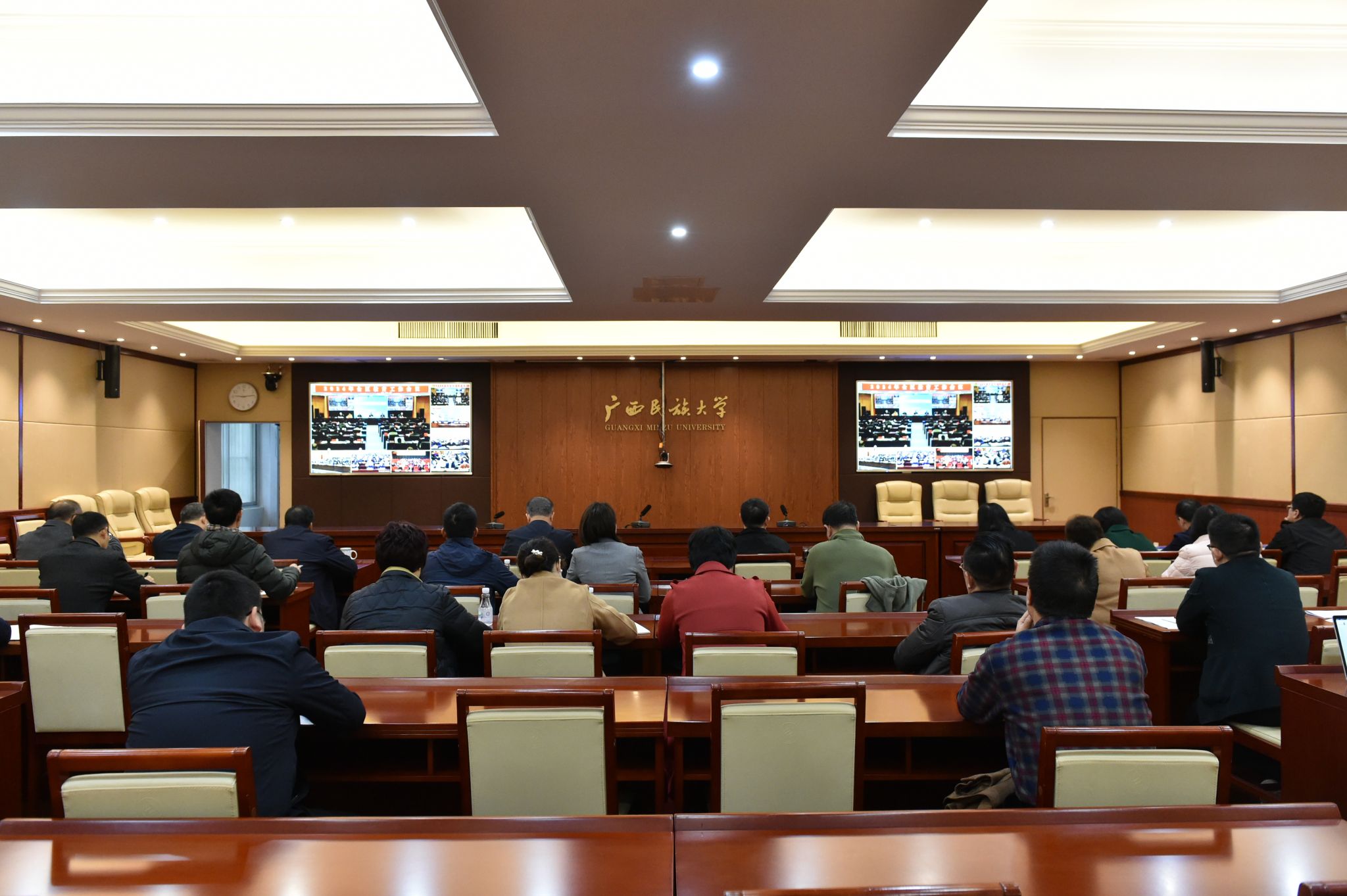 会议以视频形式召开,广西民族大学在校领导班子成员及有关职能部门负责人在学校分会场参加会议。