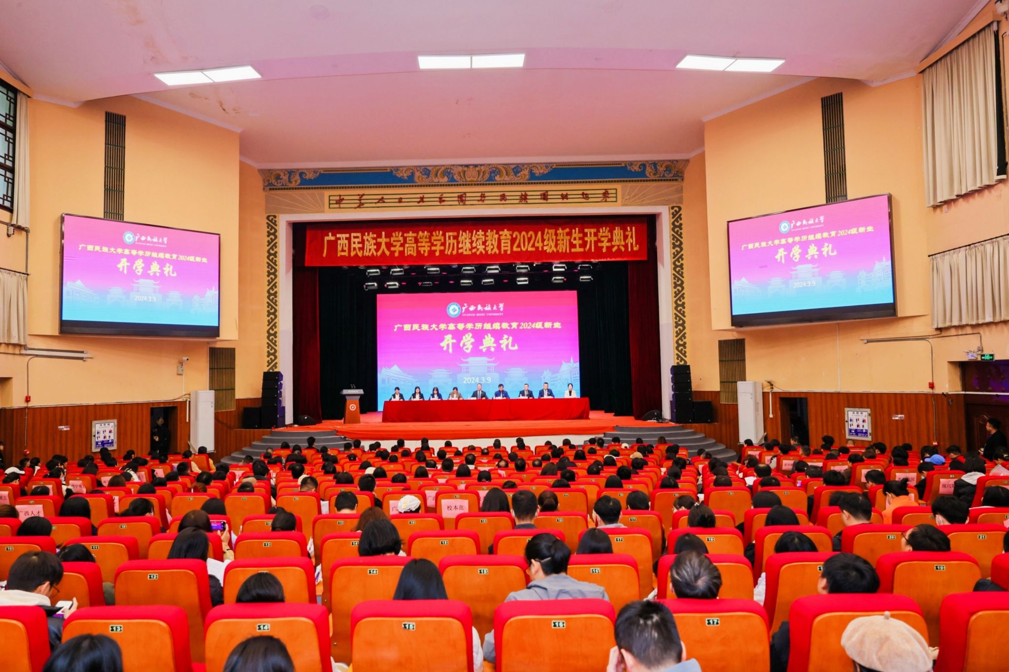 3月9日上午,广西民族大学在相思湖校区大礼堂举行高等学历继续教育2024级新生开学典礼。学校党委常委、副校长何立荣出席典礼并讲话,近500名新生代表参加开学典礼。