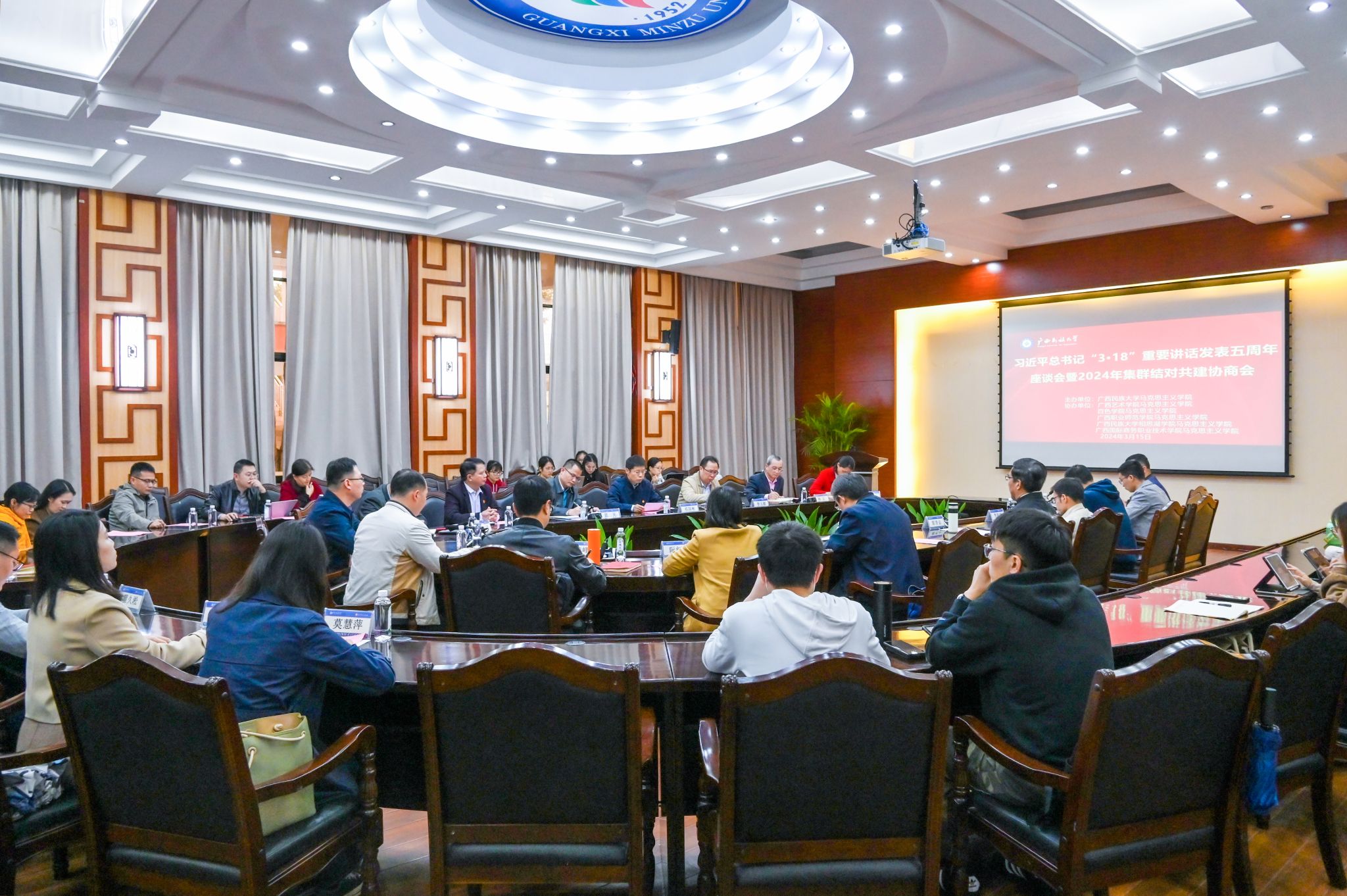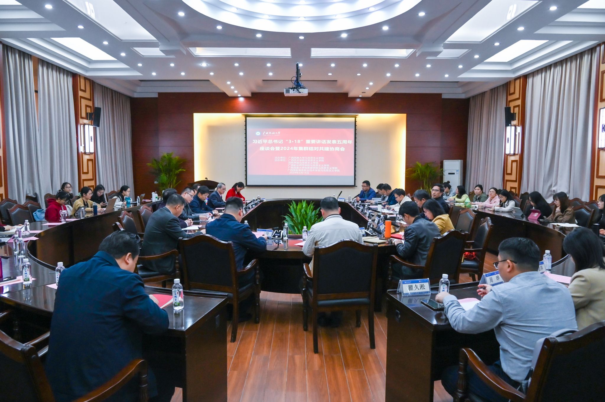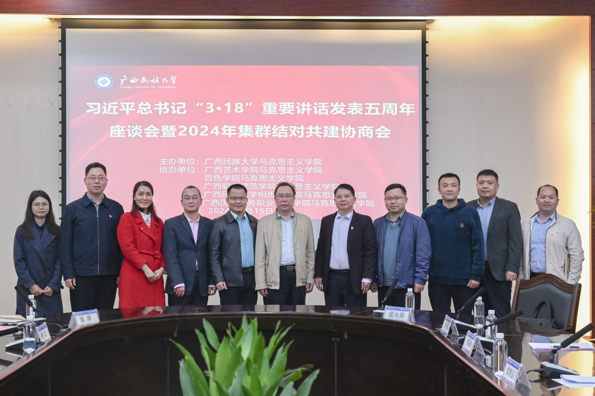 【大学生通讯社报道】3月15日下午,广西民族大学在国际合作与交流处大会议室召开习近平总书记“3•18”重要讲话发表五周年座谈会暨2024年集群结对共建协商会。广西民族大学党委副书记邓国彬出席会议。百色学院、广西艺术学院等区内高校马克思主义学院专家学者及我校马克思主义学院师生代表与会。