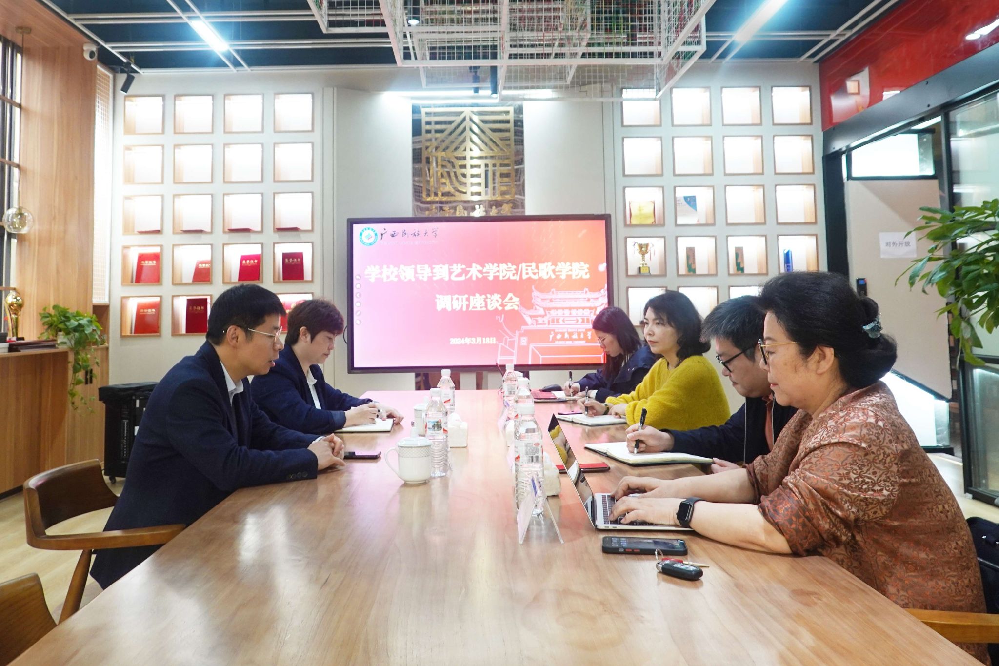 【校领导到艺术学院、民歌学院调研】3月18日,学校党委副书记邓国彬到艺术学院、民歌学院调研。他强调,学校艺术团建设需要联合多方共建共商,探索一条切实可行的新路径,形成可操作性、稳定的机制;要落实教育部美育教育精神,进一步加强团队建设,提升团队水平,将学校艺术团打造成学校的一张名片,为本科教育教学添砖加瓦。