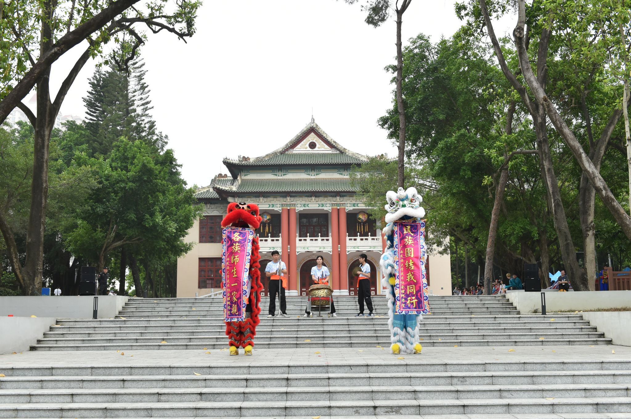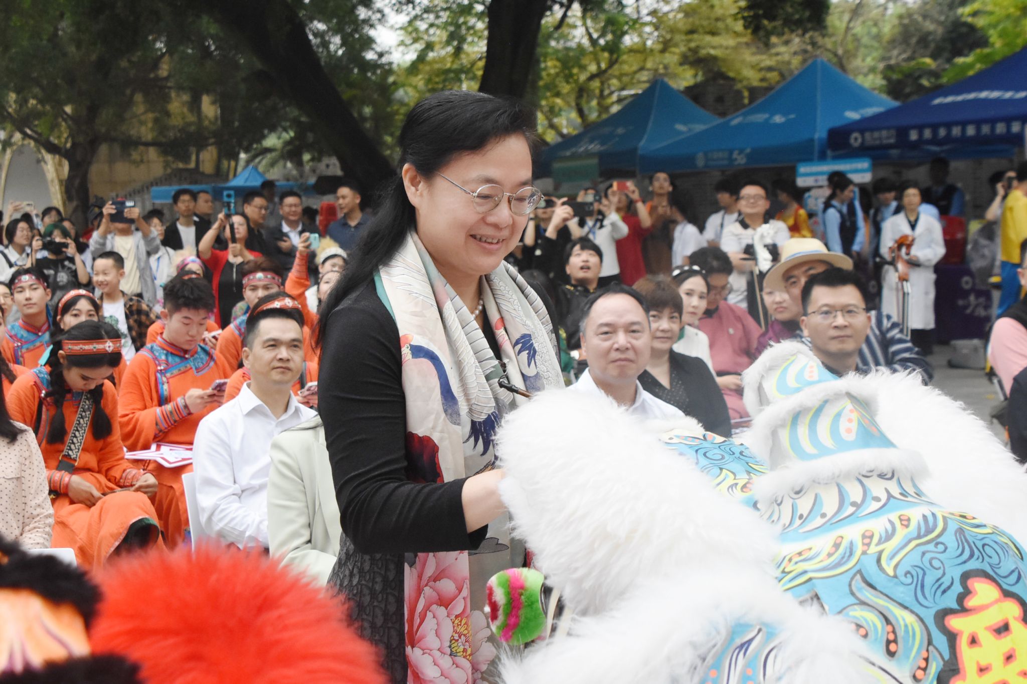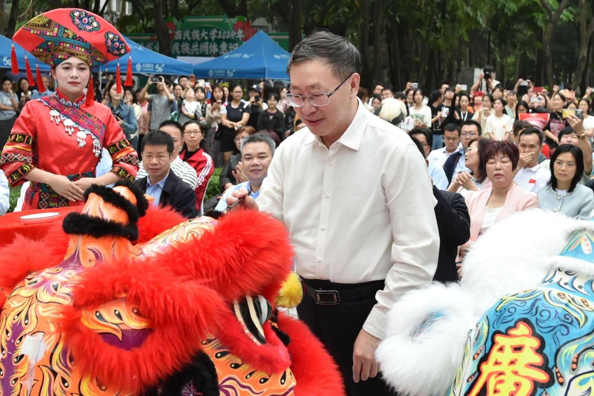 广西民族大学党委书记卞成林,校长韦仕珍为迎宾双狮点睛,活动正式拉开帷幕。鼓点铿锵有力,两头狮子时而嬉戏打闹,时而摇头摆尾,时而翘首仰视,动作俏皮可爱。随着鼓声大震,狮口中的对联顺势展开——各族师生一家亲,民族团结我同行,现场迅速升温。