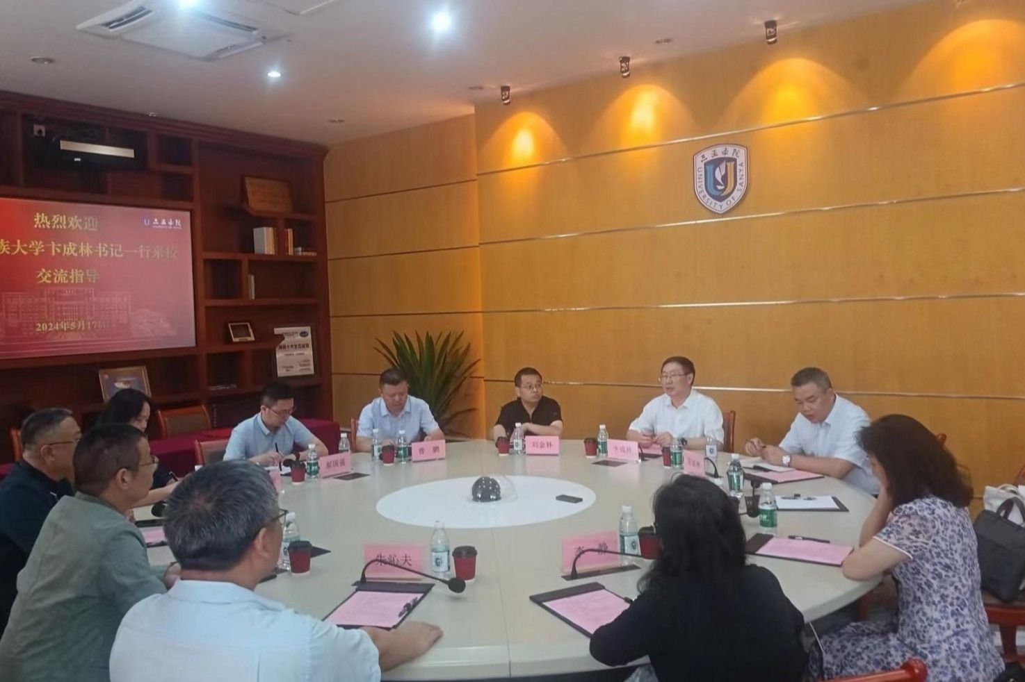 5月17日,广西民族大学党委书记、广西中华民族共同体意识研究院院长卞成林带队到三亚学院洽谈合作事宜。广西民族大学党委副书记陈铭彬,三亚学院理事长、名誉校长、吉利人才发展集团CEO陆丹,三亚学院校长沈建勇,副校长朱沁夫参加座谈会。