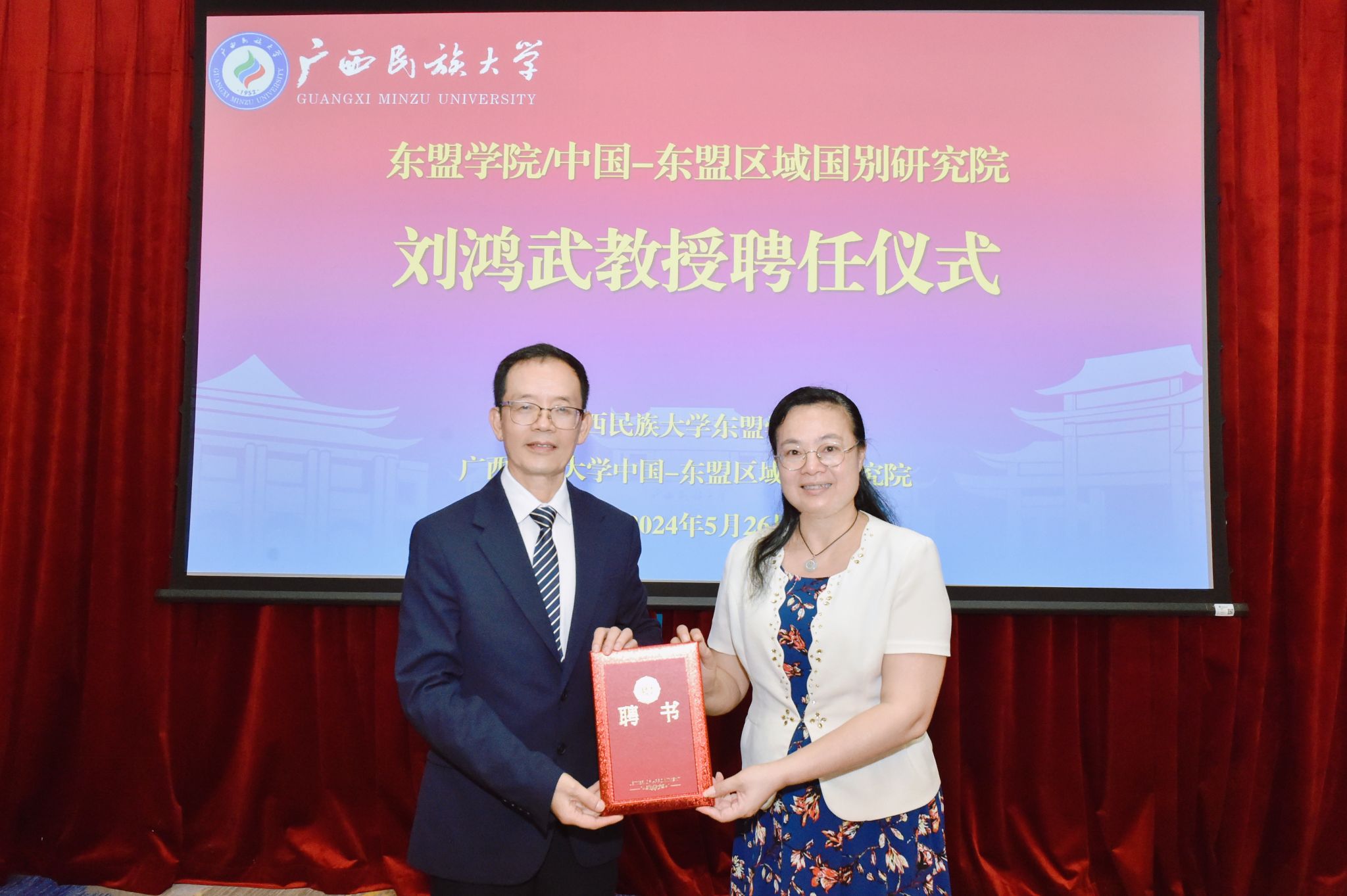 会前,韦仕珍为刘鸿武颁发广西民族大学名誉教授聘书。