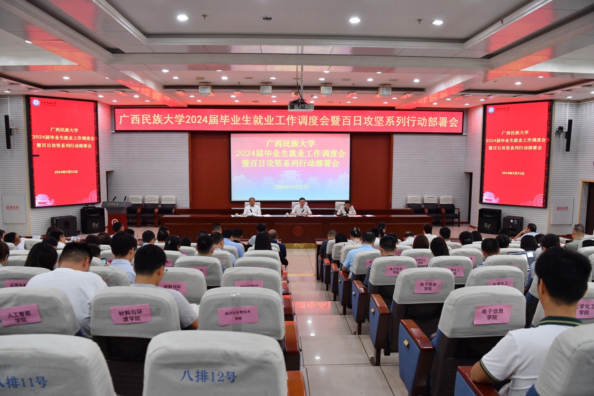 【大学生通讯社报道】5月31日上午,广西民族大学2024届毕业生就业工作调度会暨百日攻坚系列行动部署会在科技楼报告厅召开。校党委书记卞成林,校长韦仕珍出席会议,副校长姜明国主持会议,有关职能部门及各学院有关负责人参加会议。
