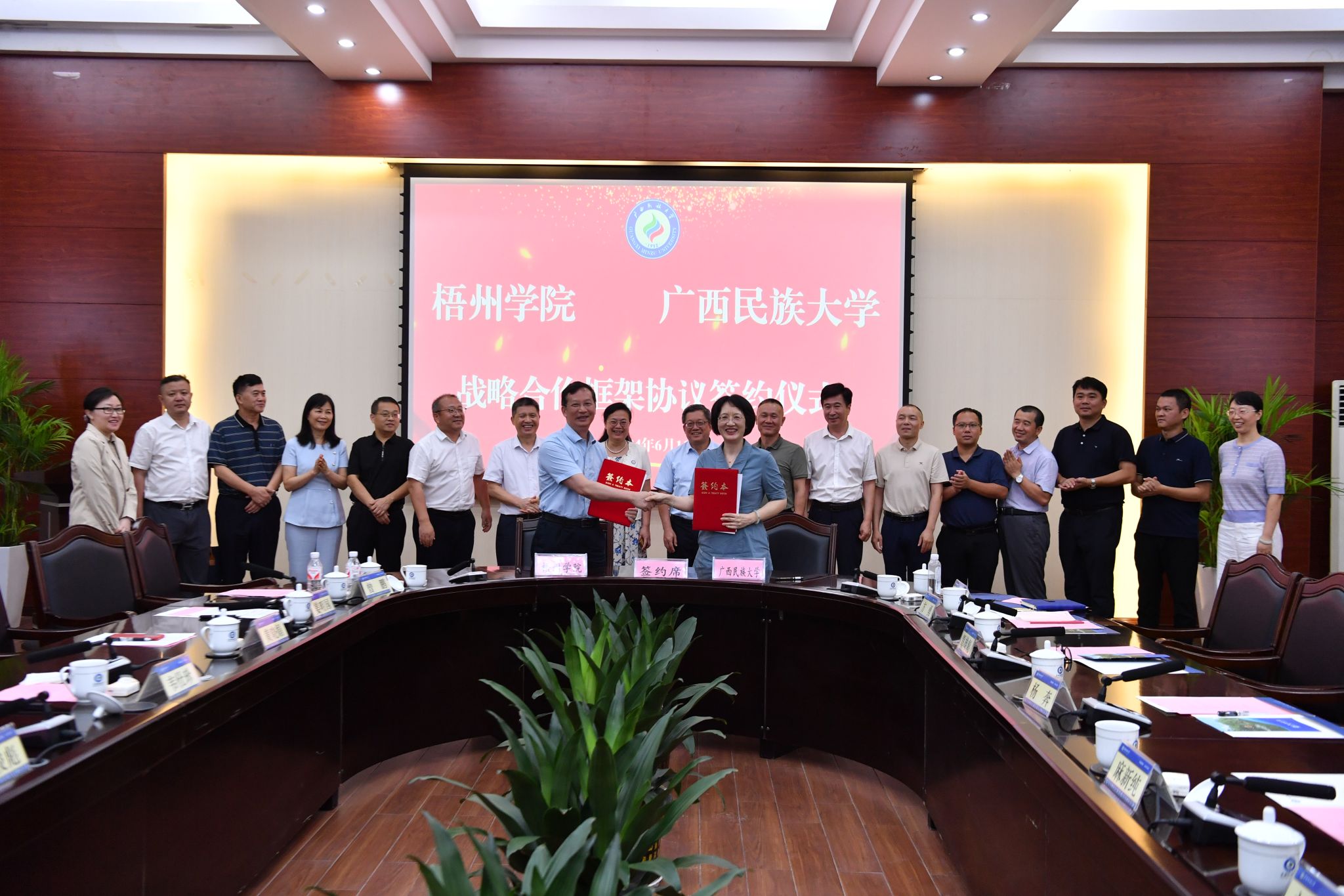 【大学生通讯社报道】6月11日下午,校长韦仕珍会见来校交流的梧州学院校长杨奔一行,双方就学科专业建设、智慧校园建设等方面交流并签署战略合作框架协议。广西民族大学副校长黄晓娟、吕俊彪、姜明国,梧州学院副校长麻新纯、覃雄彪出席座谈会。姜明国主持会议。