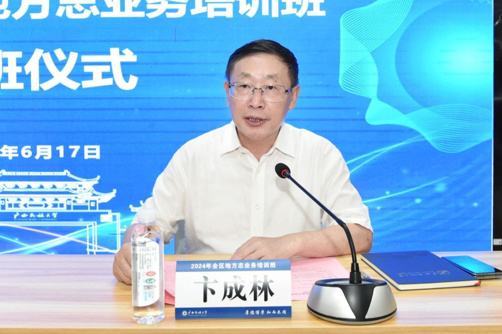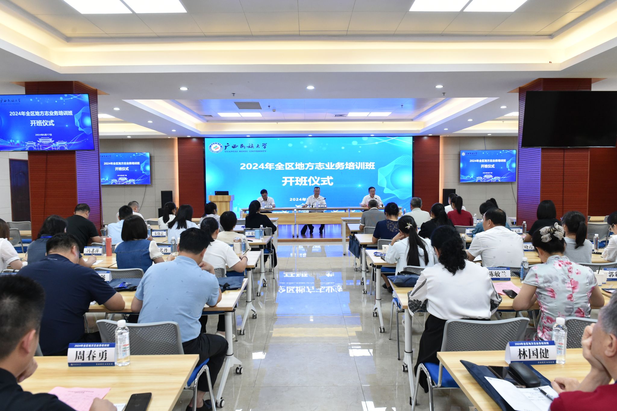 6月17日,2024年全区地方志业务培训班在广西民族大学开班。自治区地方志办党组书记、主任梁志强出席开班仪式并作动员讲话,广西民族大学党委书记、广西中华民族共同体意识研究院院长卞成林致辞并为培训班学员作首场辅导报告。自治区地方志办党组成员、副主任吴辉军主持开班仪式。全区地方志系统干部共50名学员参加培训。