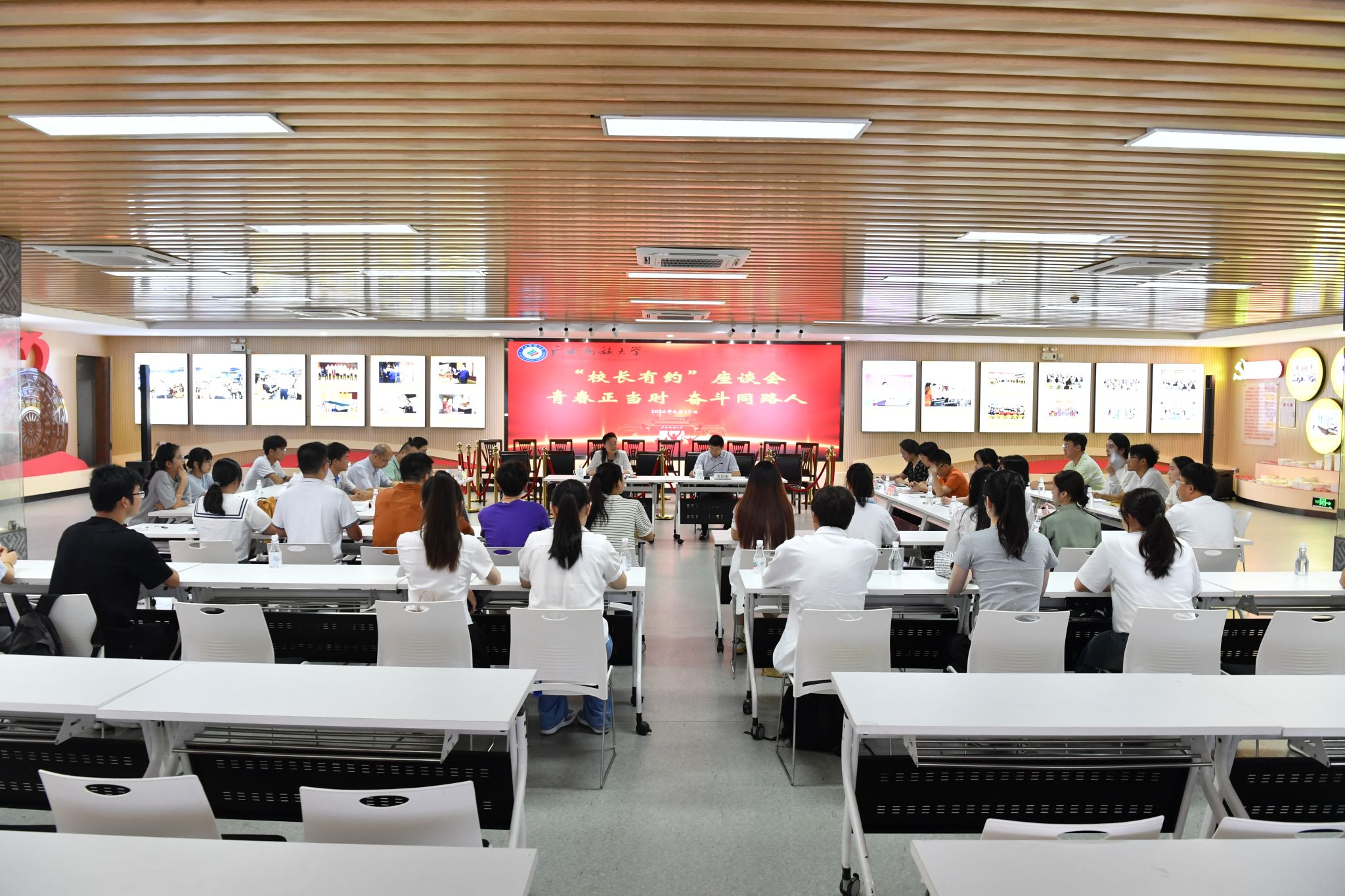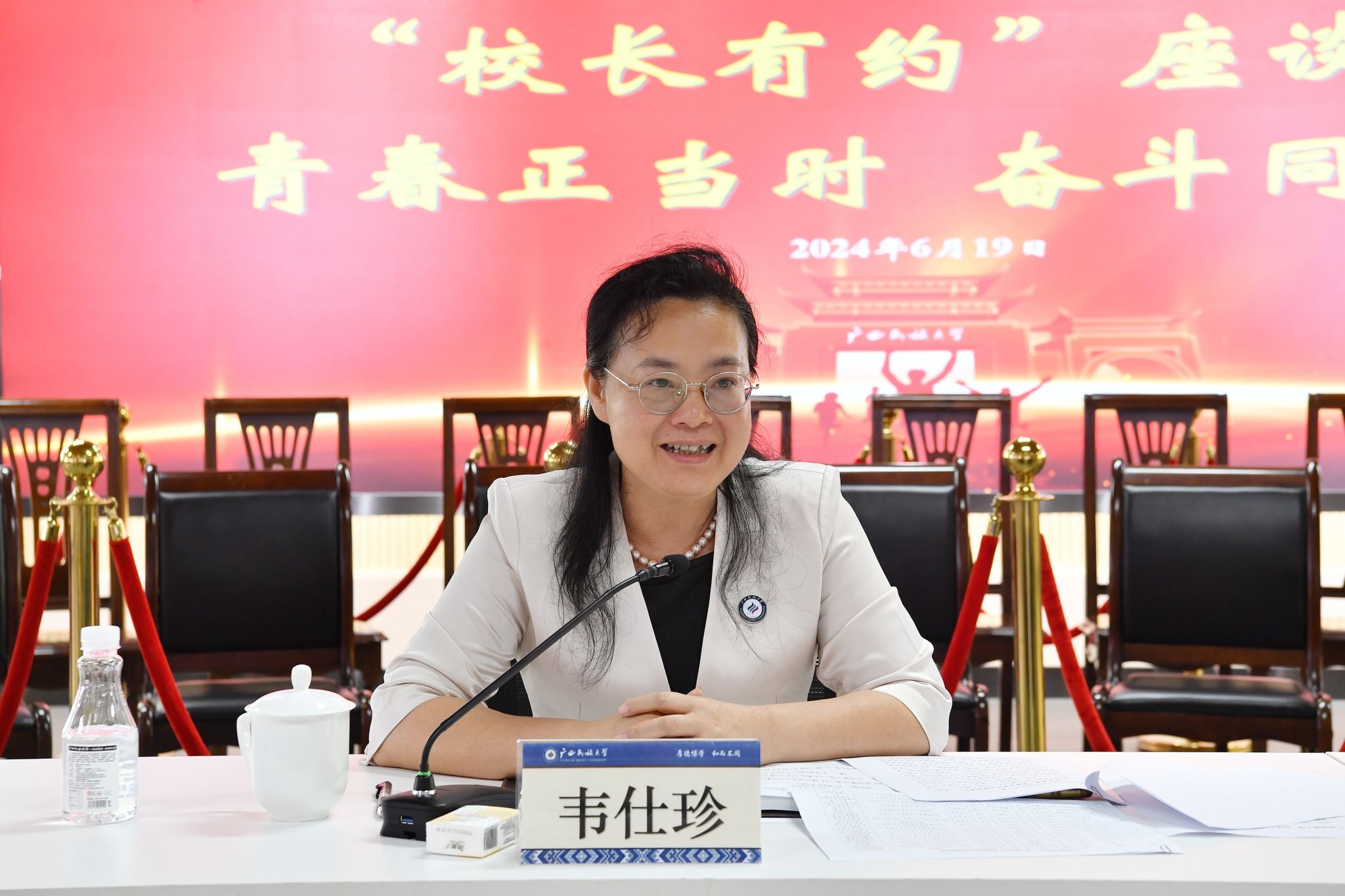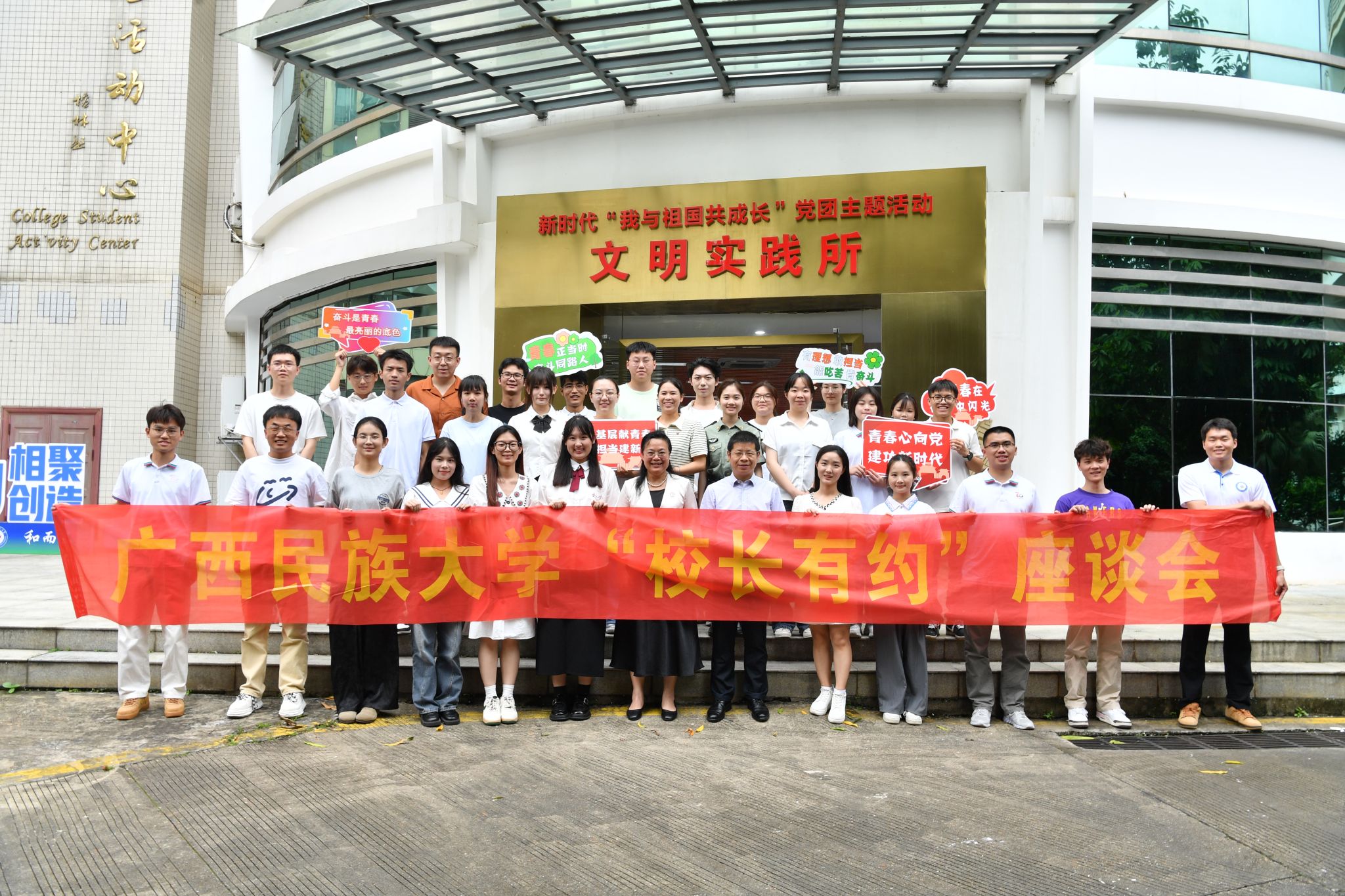 【大学生通讯社报道】6月19日下午,广西民族大学“校长有约”座谈会在相思湖校区新时代“我与祖国共成长”党团主题活动文明实践所召开,校长韦仕珍出席座谈会并向学生代表赠送书籍《习近平与大学生朋友们(第二卷)》,校党委副书记邓国彬主持会议,2024届毕业生代表参加座谈会。