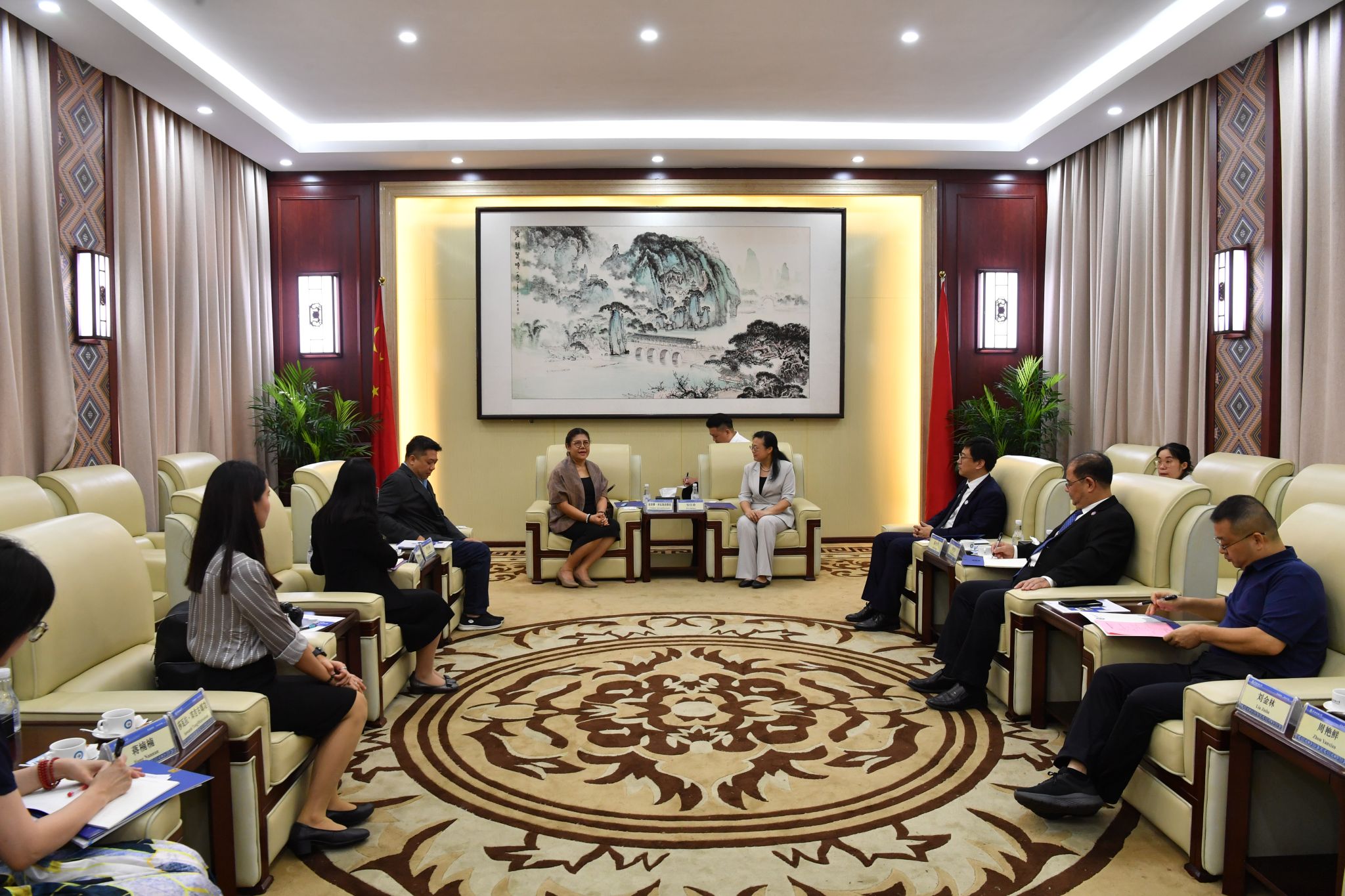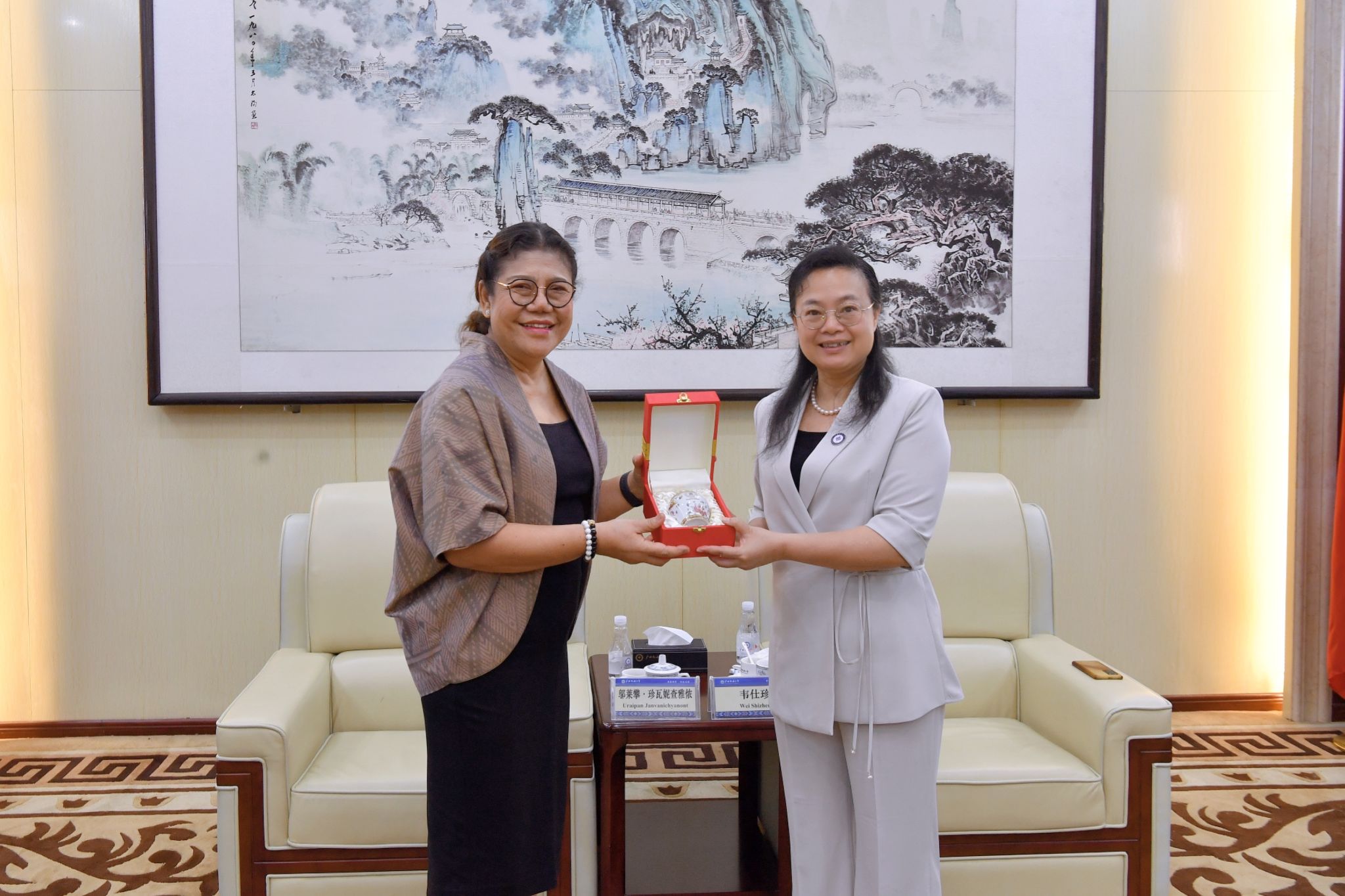【大学生通讯社报道】6月24日上午,校长韦仕珍在国际合作与交流处会见来校访问的泰国华侨崇圣大学校长邬莱攀·珍瓦妮查雅侬一行,副校长高兴宇陪同会见。
