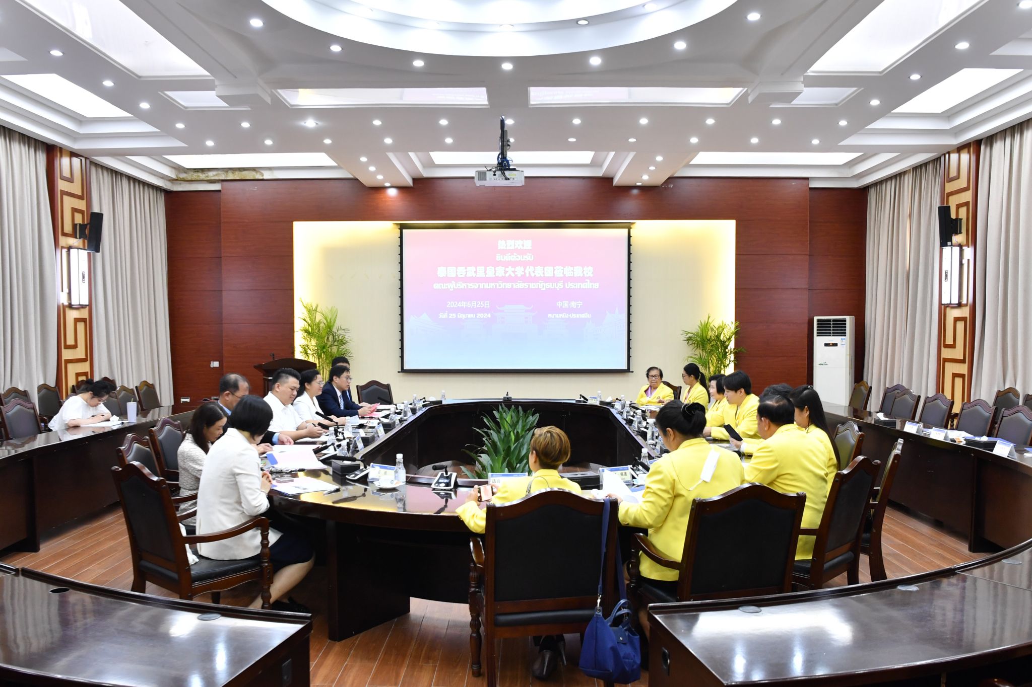 【大学生通讯社报道】6月25日上午,校长韦仕珍会见来校访问的泰国吞武里皇家大学校长玉娃腊·韦查威塔雅克棱一行。座谈会由副校长高兴宇主持。