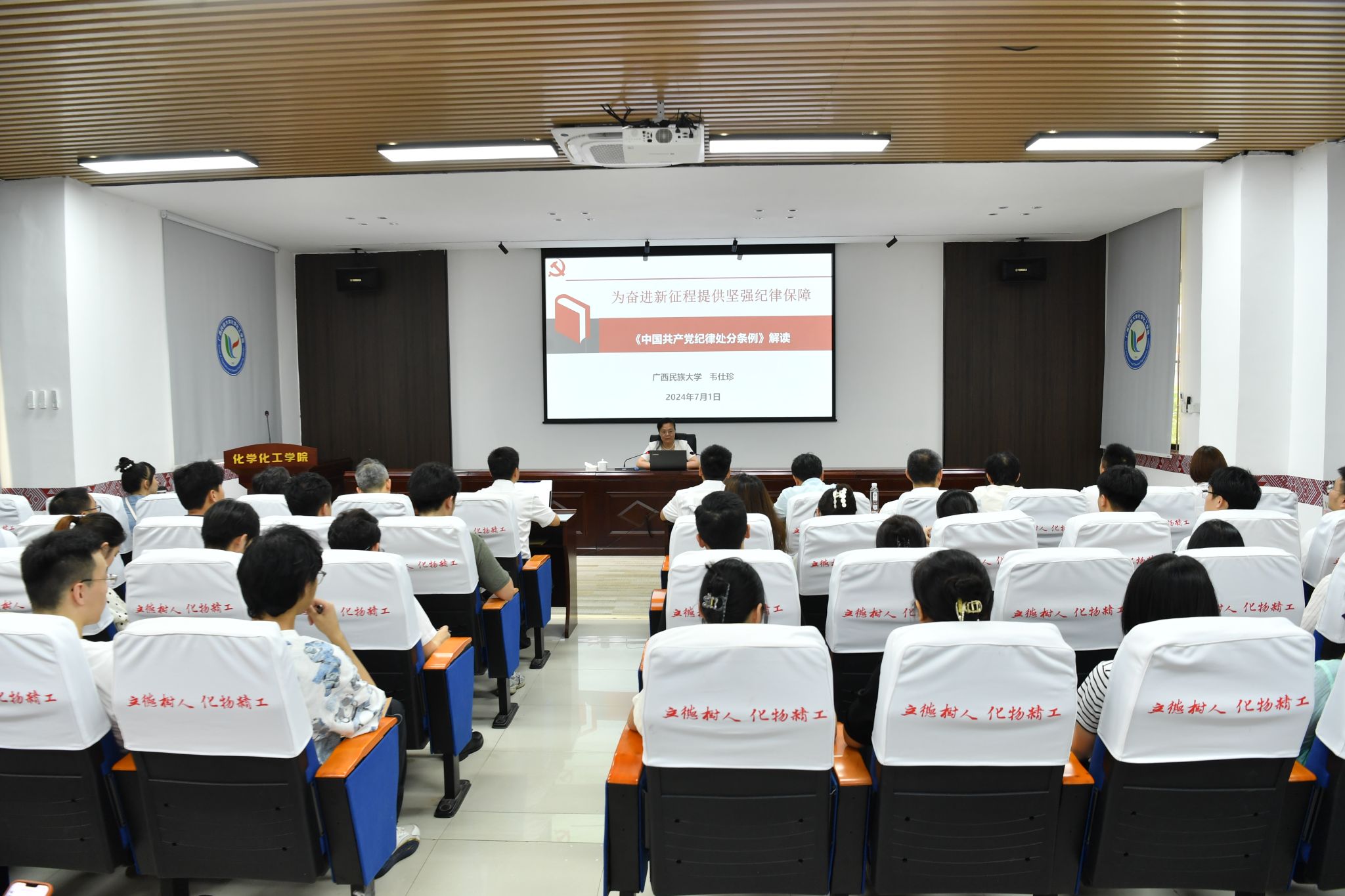 【大学生通讯社报道】7月1日下午,广西民族大学党委副书记、校长韦仕珍在思源湖校区扬帆楼109会议室讲授党纪学习教育纪律党课,以“为奋进新征程提供坚强纪律保障”为题,对新修订的《中国共产党纪律处分条例》(以下简称《条例》)进行解读。