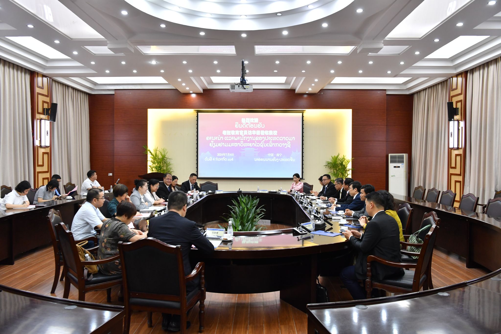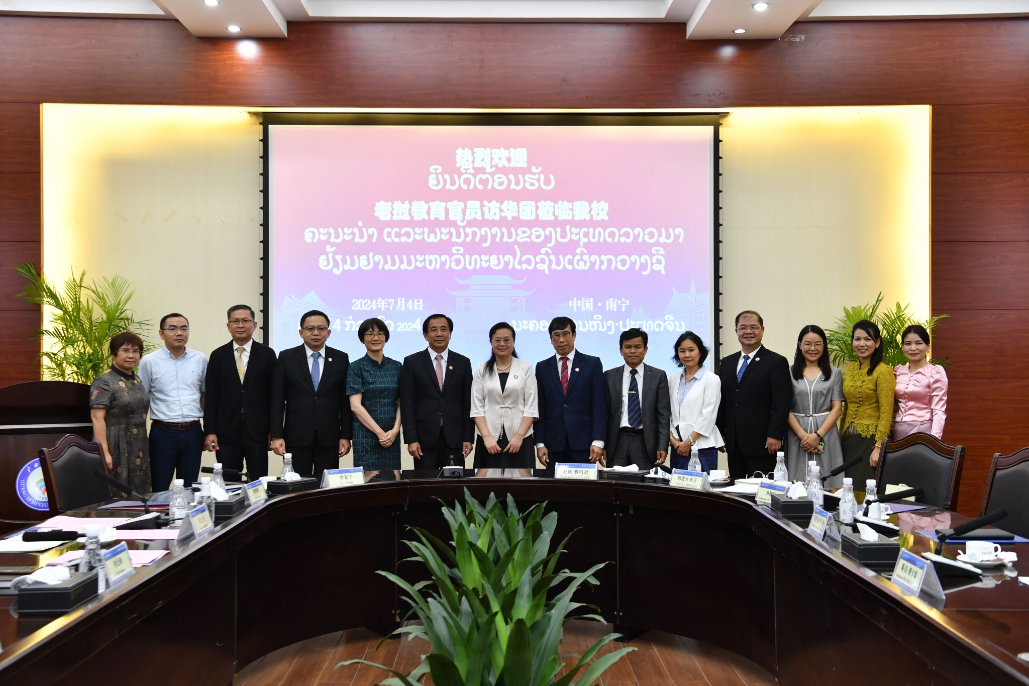 7月4日下午,广西民族大学校长韦仕珍会见由老挝教育体育部副部长桑拉•潘卡翁、老挝国立大学校长德沙努腊•散杜昂德等组成的老挝教育官员访华团一行。座谈交流会在国际合作与交流处会议室举行。