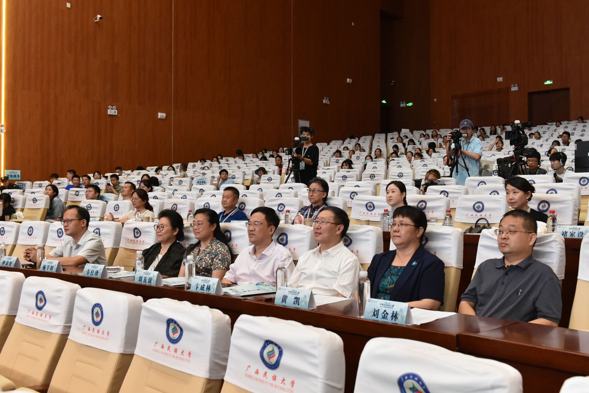 自治区党委教育工委副书记、自治区教育厅党组书记、厅长刘友谊,自治区教育厅二级巡视员赵成光,广西民族大学党委书记卞成林,校长韦仕珍,副校长姜明国,全国中华经典诵读大赛项目负责人马惠玲等领导和嘉宾出席本次活动。来自14个设区市和部分高校共1200多名师生、家长、各界群众到场观摩。