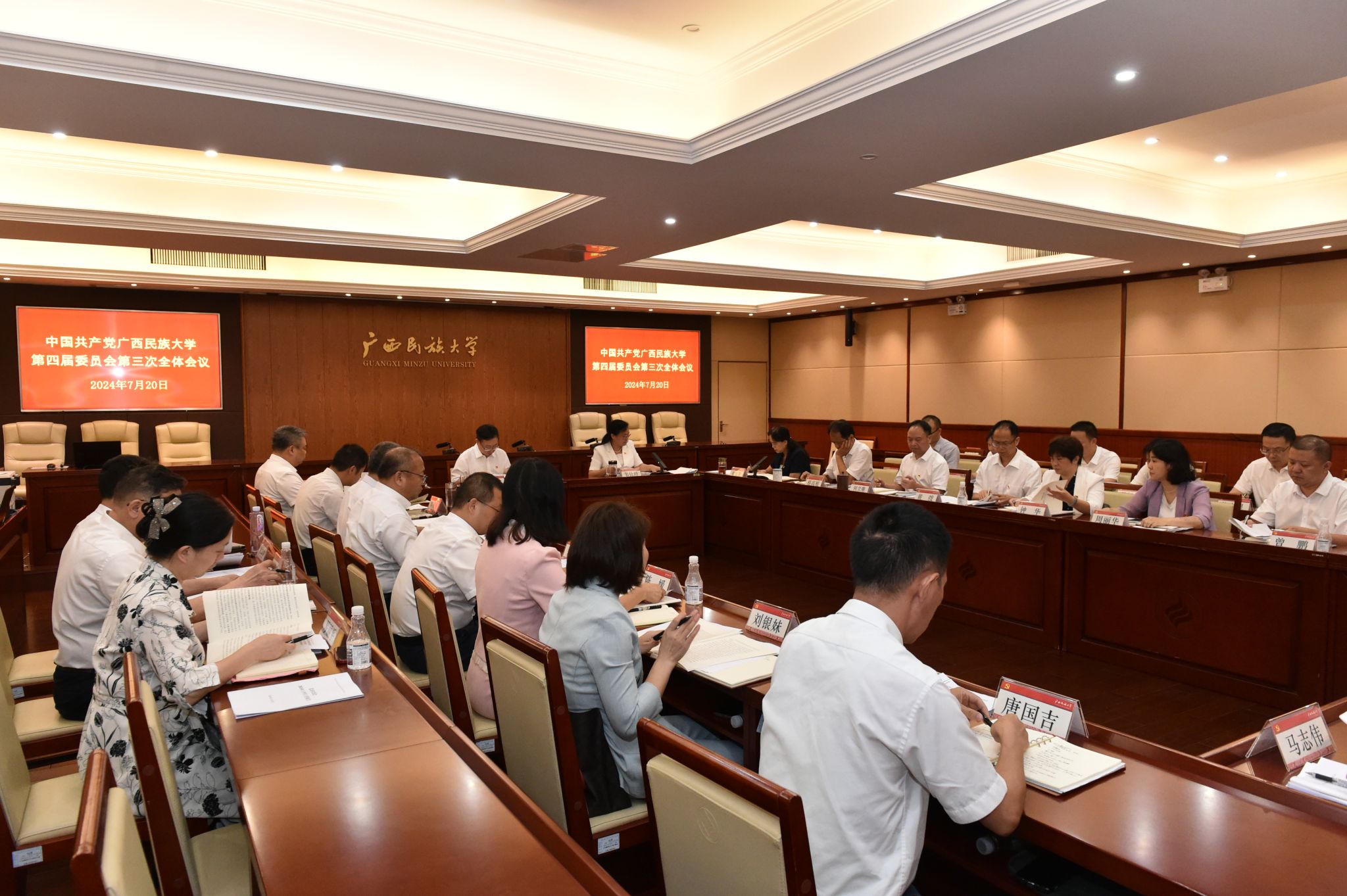 7月20日下午,中国共产党广西民族大学第四届委员会第三次全体会议在办公楼212会议室召开。会议审议通过学校党委书记卞成林代表学校党委常委会作的2024年上半年工作报告,审议通过学校纪委2024年上半年工作报告(书面)。学校党委副书记、校长韦仕珍主持会议。