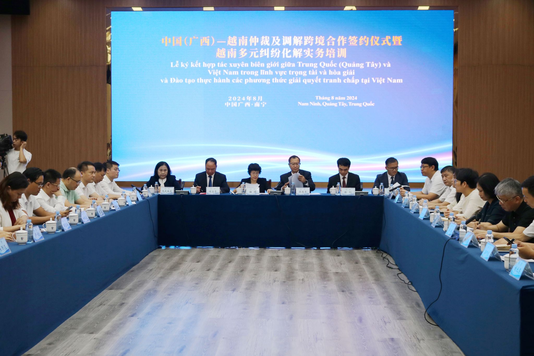 8月2日,中国(广西)-越南仲裁及调解跨境合作签约仪式暨越南多元纠纷化解实务培训在南宁举行,广西民族大学中国-东盟法学院、广西贸促会、百色仲裁委员会分别与越南商业仲裁中心、越南河内贸易调解中心签署合作备忘录,共同开展商事纠纷多元化解的跨境合作新模式建设。广西民族大学副校长、中国-东盟法学院院长何立荣出席活动并签订协议。