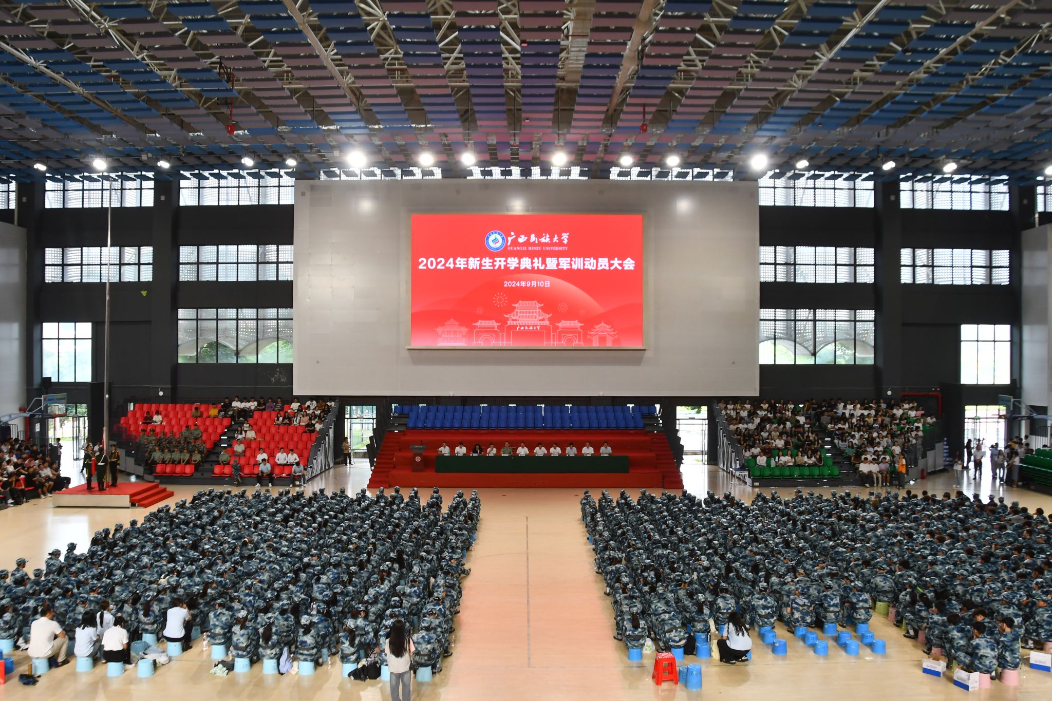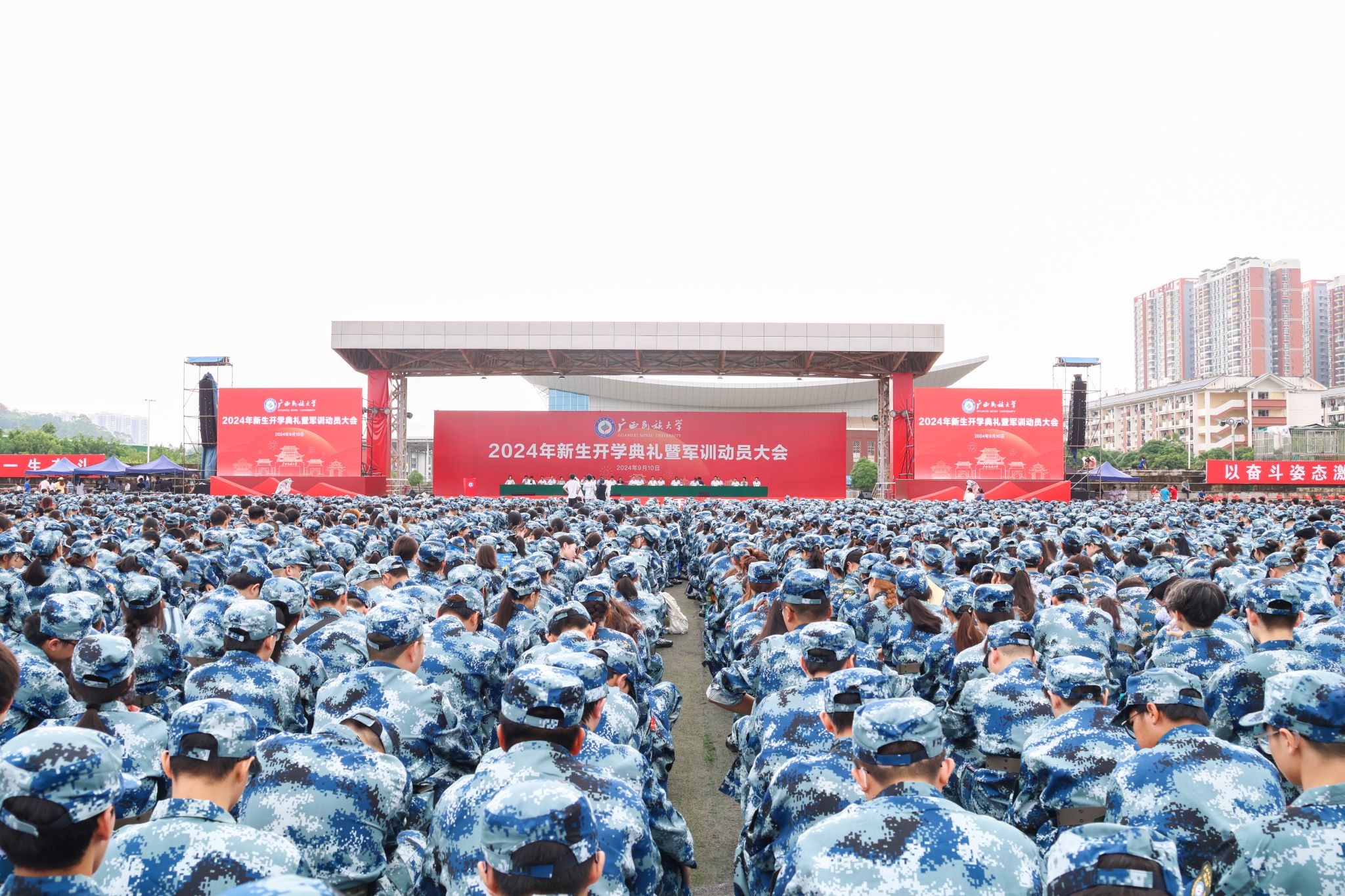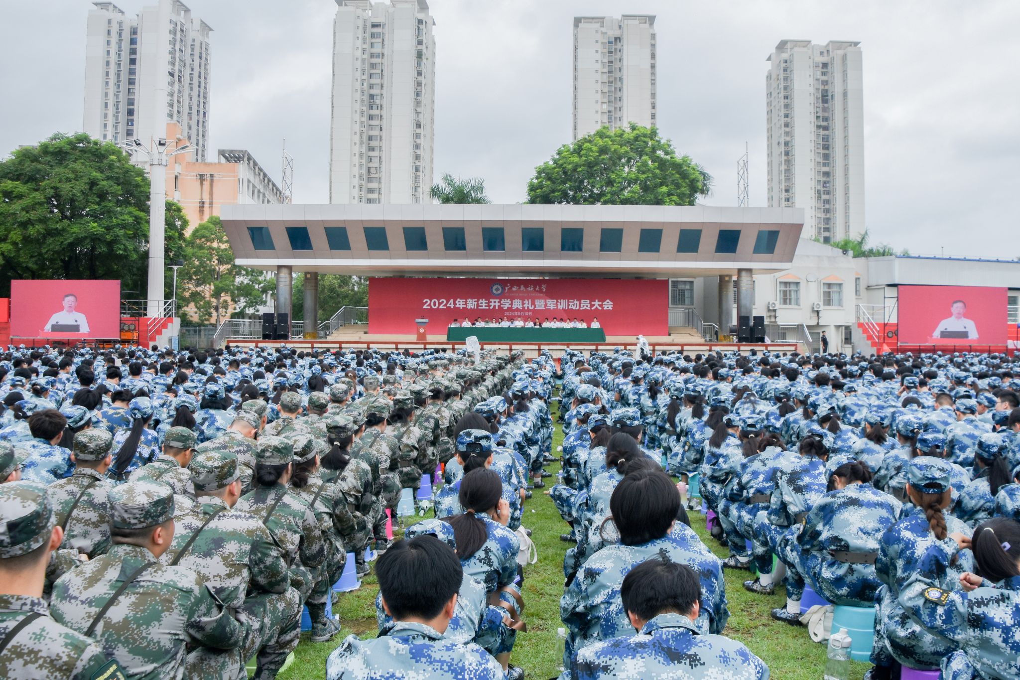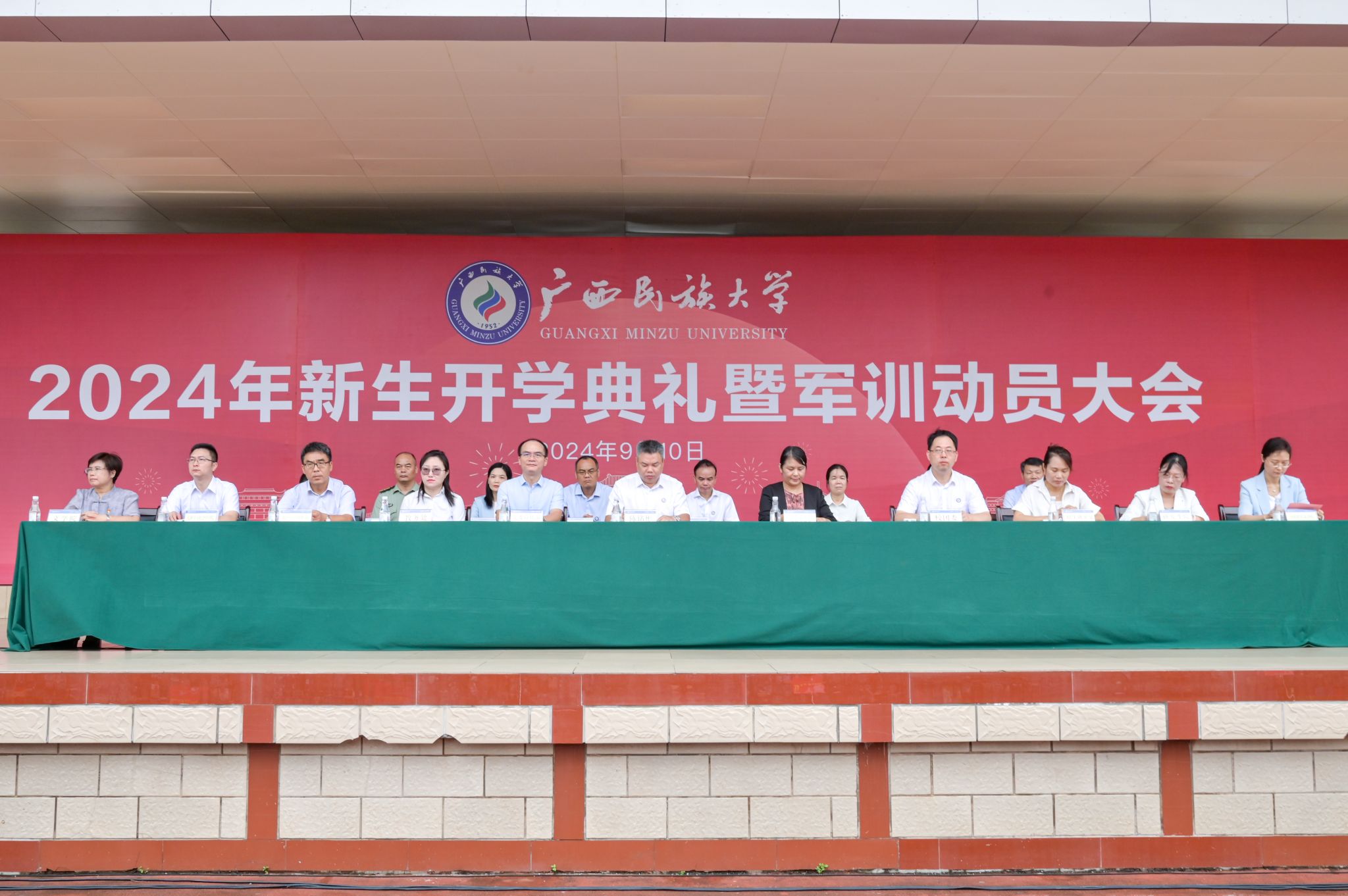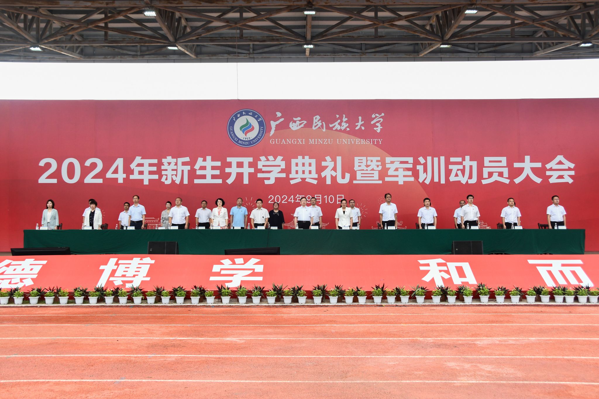 【大学生通讯社报道】9月10日上午,广西民族大学2024年新生开学典礼暨军训动员大会在思源湖校区李宁田径场、相思湖校区田径场、武鸣校区体育馆同步举行。学校党委书记卞成林,校长韦仕珍,校领导陈铭彬、邓国彬、蔡高根、黄晓娟、吕俊彪、何立荣、姜明国、高兴宇,学校有关职能部门、各学院负责人,教师代表,2024级全体新生参加典礼。