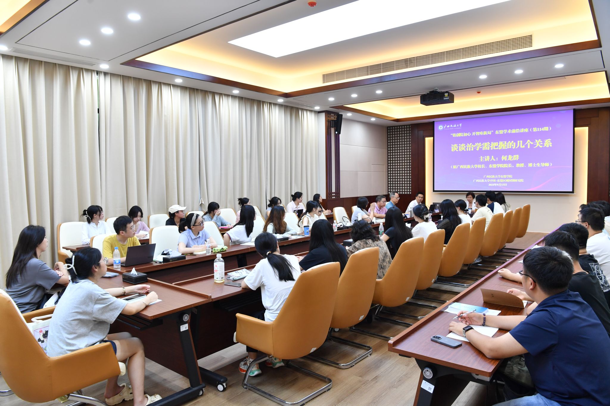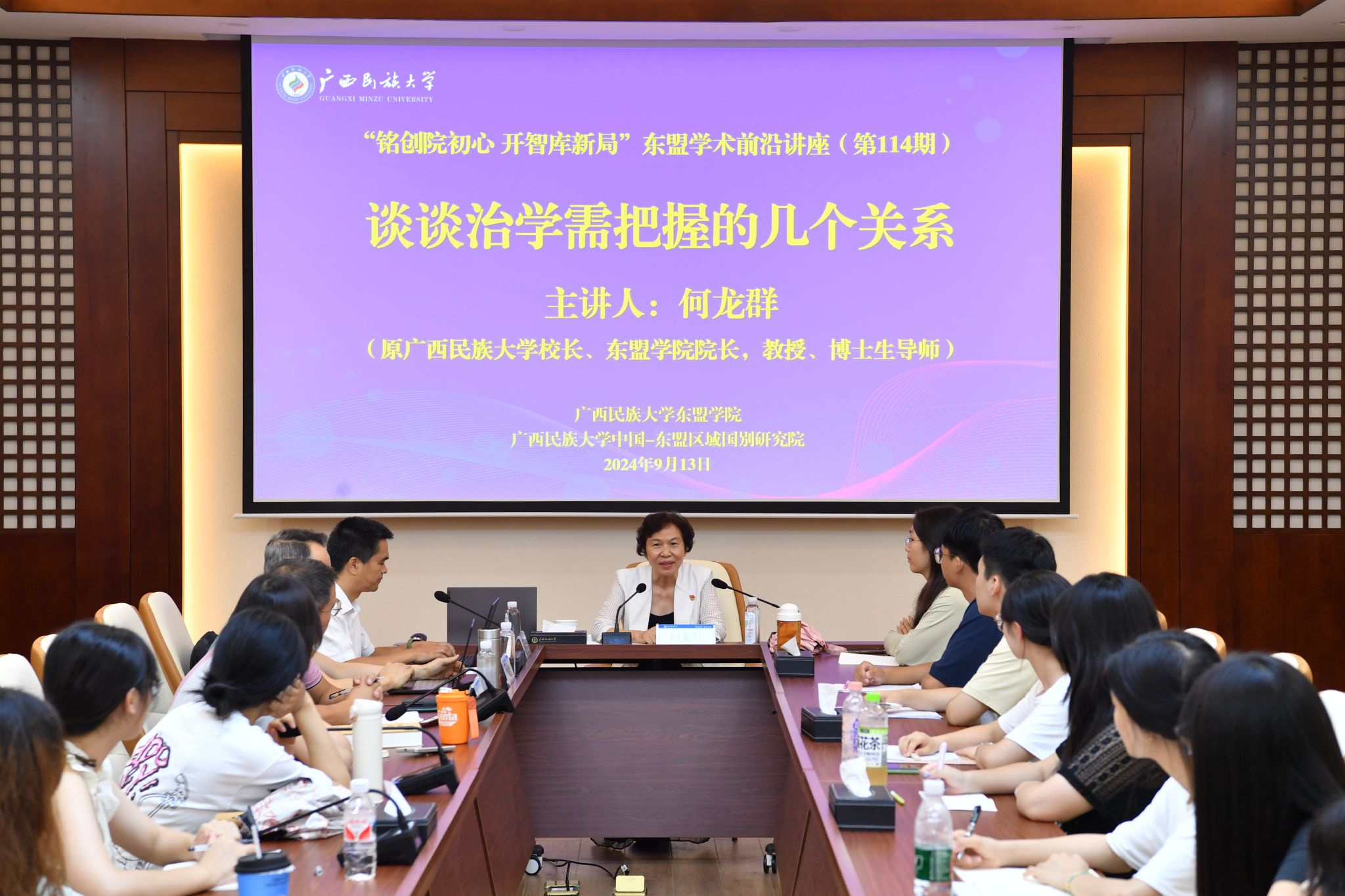 【大学生通讯社报道】9月13日,“治学需把握的几个关系”主题讲座在东盟楼1号楼105会议室举行。讲座由广西民族大学原校长何龙群教授主讲。讲座前,广西民族大学校长韦仕珍教授会见何龙群。