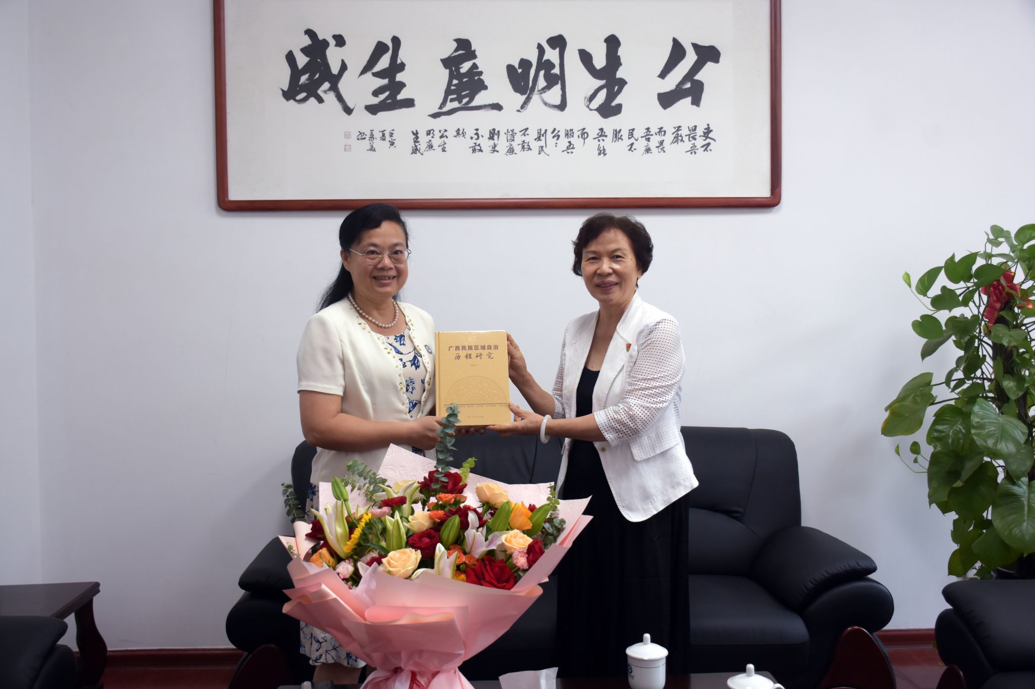 何龙群向韦仕珍赠送其著作《广西民族区域自治历程研究》并介绍有关研究情况。(初审:叶兴艺 复审:潘之铭 终审:王文娟)