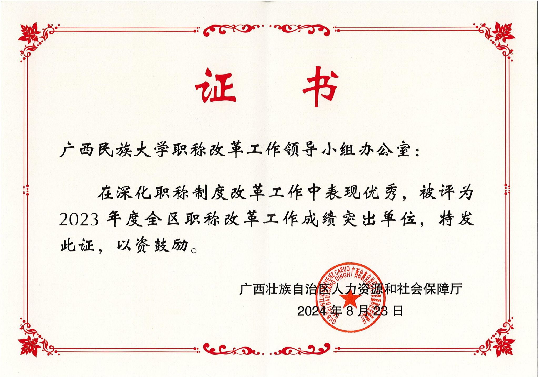 近日,自治区人力资源和社会保障厅印发《关于表扬2023年度全区职称改革工作成绩突出单位和个人的通知》,广西民族大学职称改革工作领导小组办公室被评为“2023年度全区职称改革工作成绩突出单位”,这是我校继2022年获评“2021年度全区职称改革工作先进单位”之后再获殊荣。