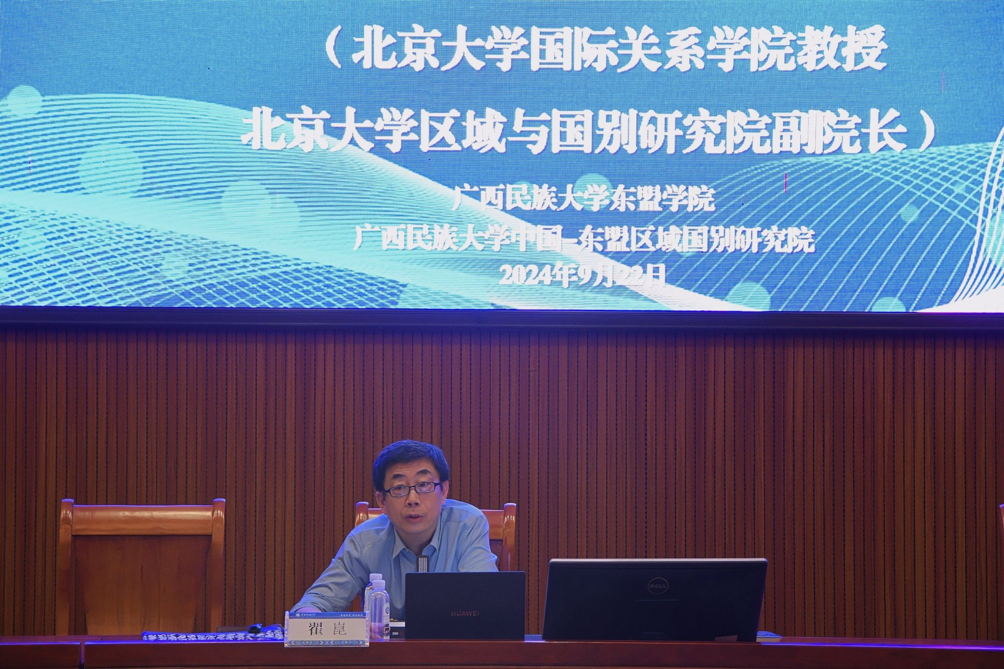 【大学生通讯社报道】9月22日,广西民族大学“中国-东盟区域国别高端讲坛”第九期报告会在思源湖校区图书馆学术报告厅举行。会前,广西民族大学党委副书记、校长韦仕珍会见了主讲人国务院学位委员会区域国别学学科评议组召集人、北京大学区域与国别研究院副院长翟崑教授。东盟学院/中国-东盟区域国别研究院、东南亚语言文化学院、法学院、经济学院部分师生参加报告会。