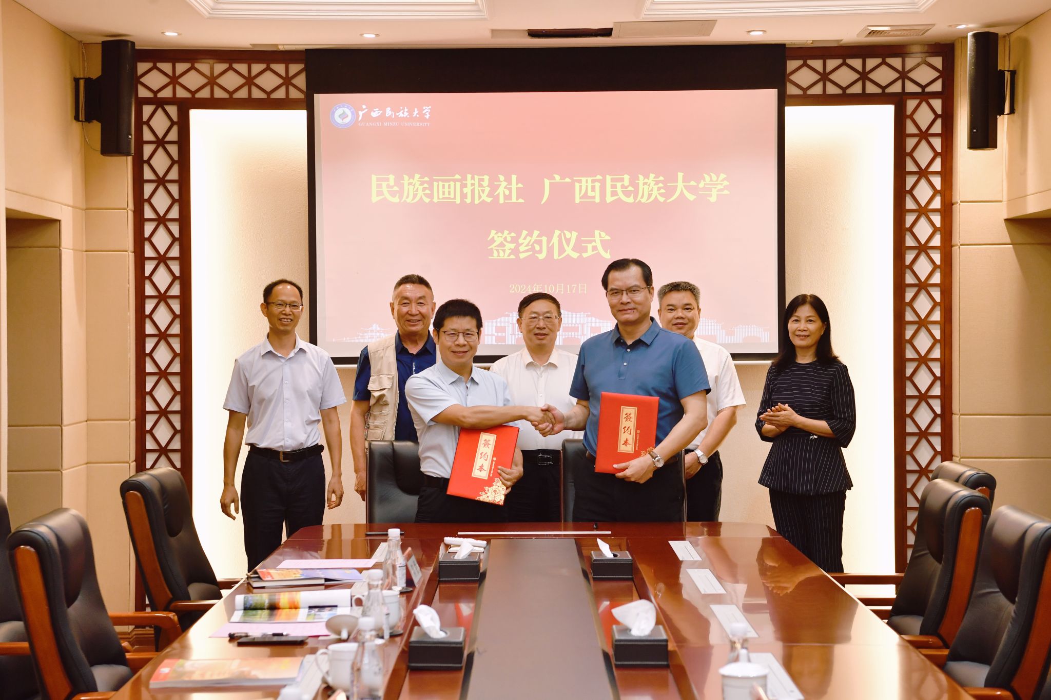 10月17日下午,广西民族大学与民族画报社举行签约仪式。学校党委书记卞成林,民族画报社党委副书记、纪委书记张继康,校党委副书记陈铭彬、邓国彬等出席仪式。