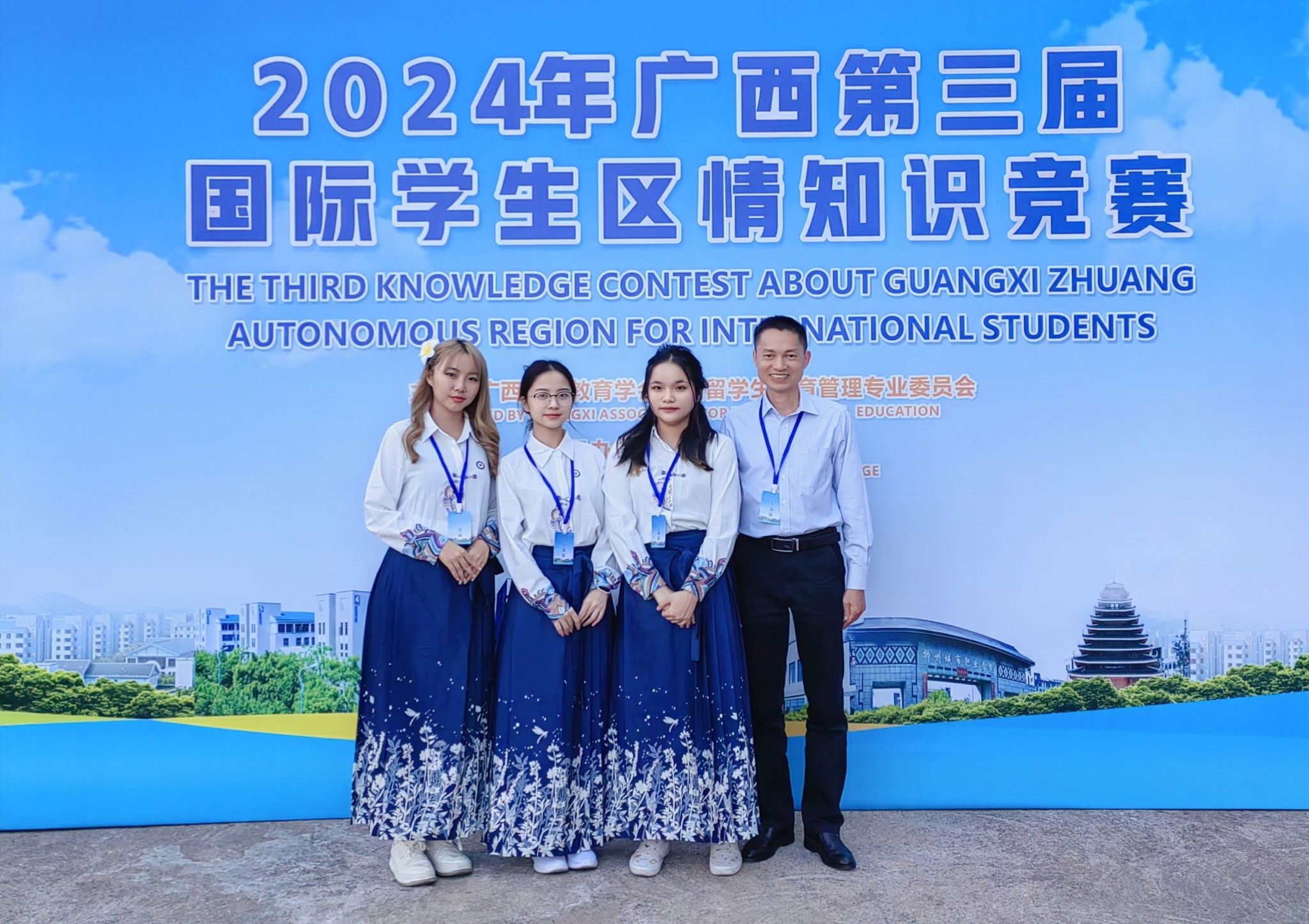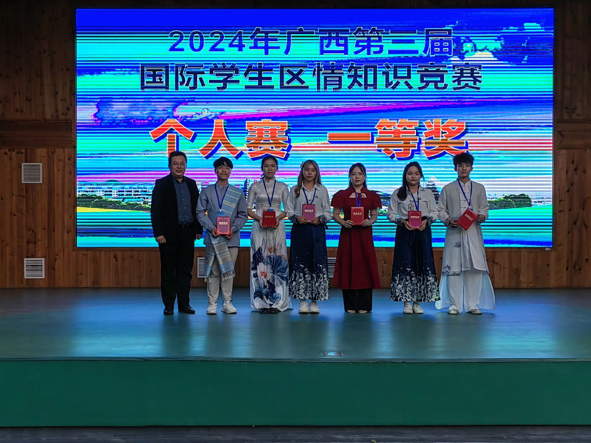 10月24—25日,由广西高等教育学会外国留学生教育管理专业委员会主办的2024年广西第三届国际学生区情知识竞赛在柳州举行。广西民族大学留学生潘陈立春、吴丽玲荣获个人赛一等奖,阮玉英荣获个人赛二等奖。团体赛中荣获三等奖。