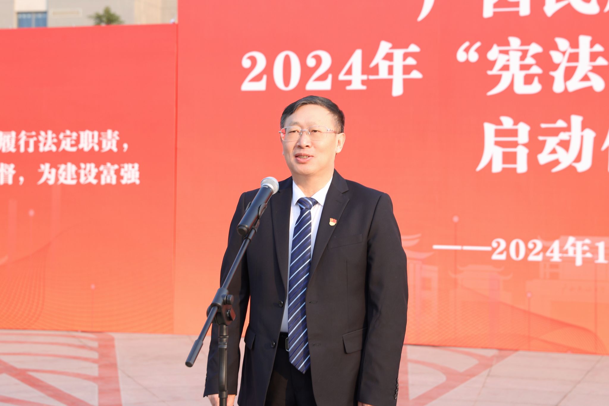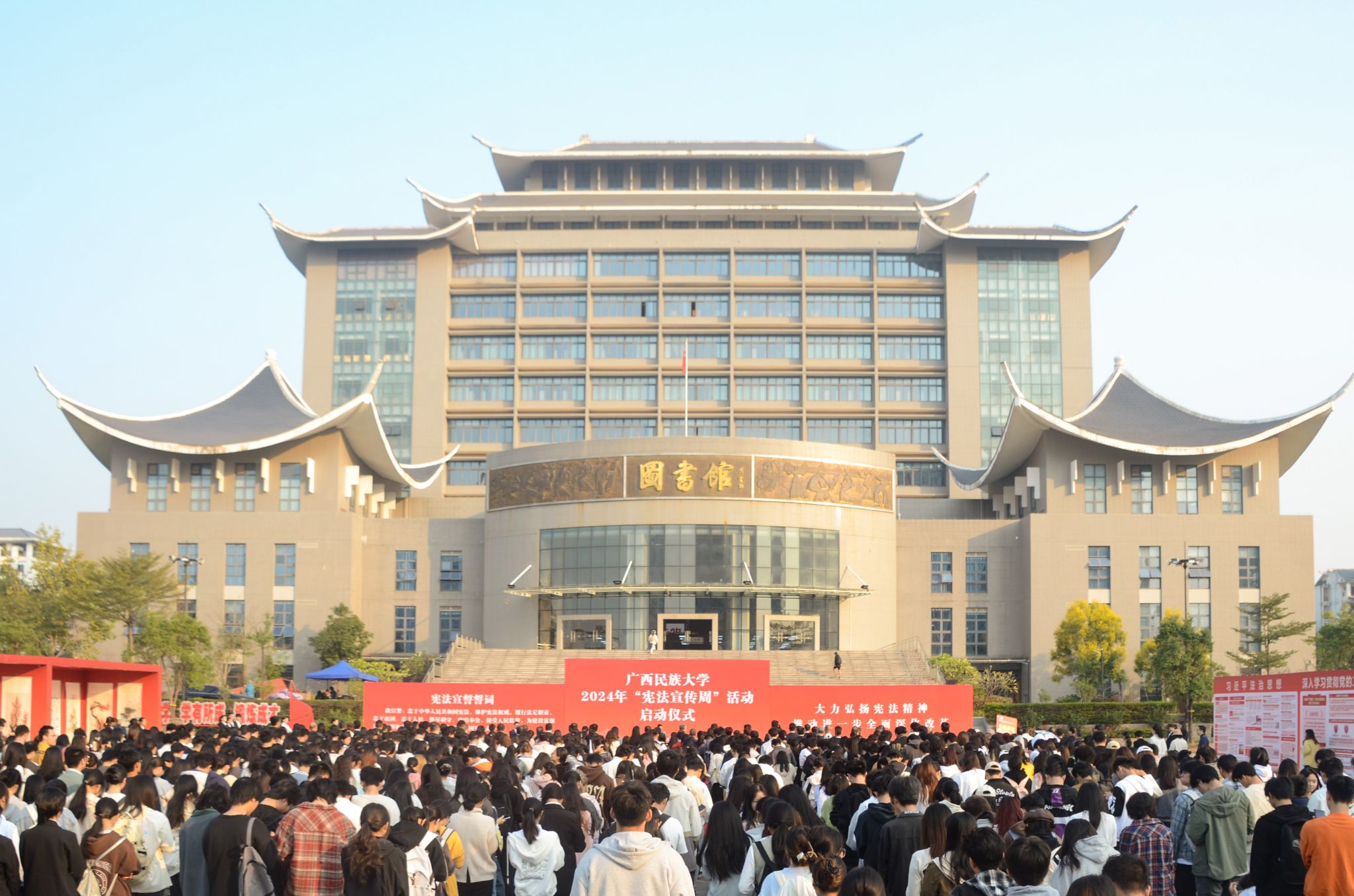 【大学生通讯社报道】12月4日上午,广西民族大学2024年“宪法宣传周”活动启动仪式在思源湖校区民族广场举行。学校党委书记卞成林出席仪式并宣布活动正式启动。校长韦仕珍出席并致辞。全体在家校领导、学校中层领导干部、法学院全体教师以及其他学院师生代表参加活动。学校党委副书记邓国彬主持仪式并领誓。