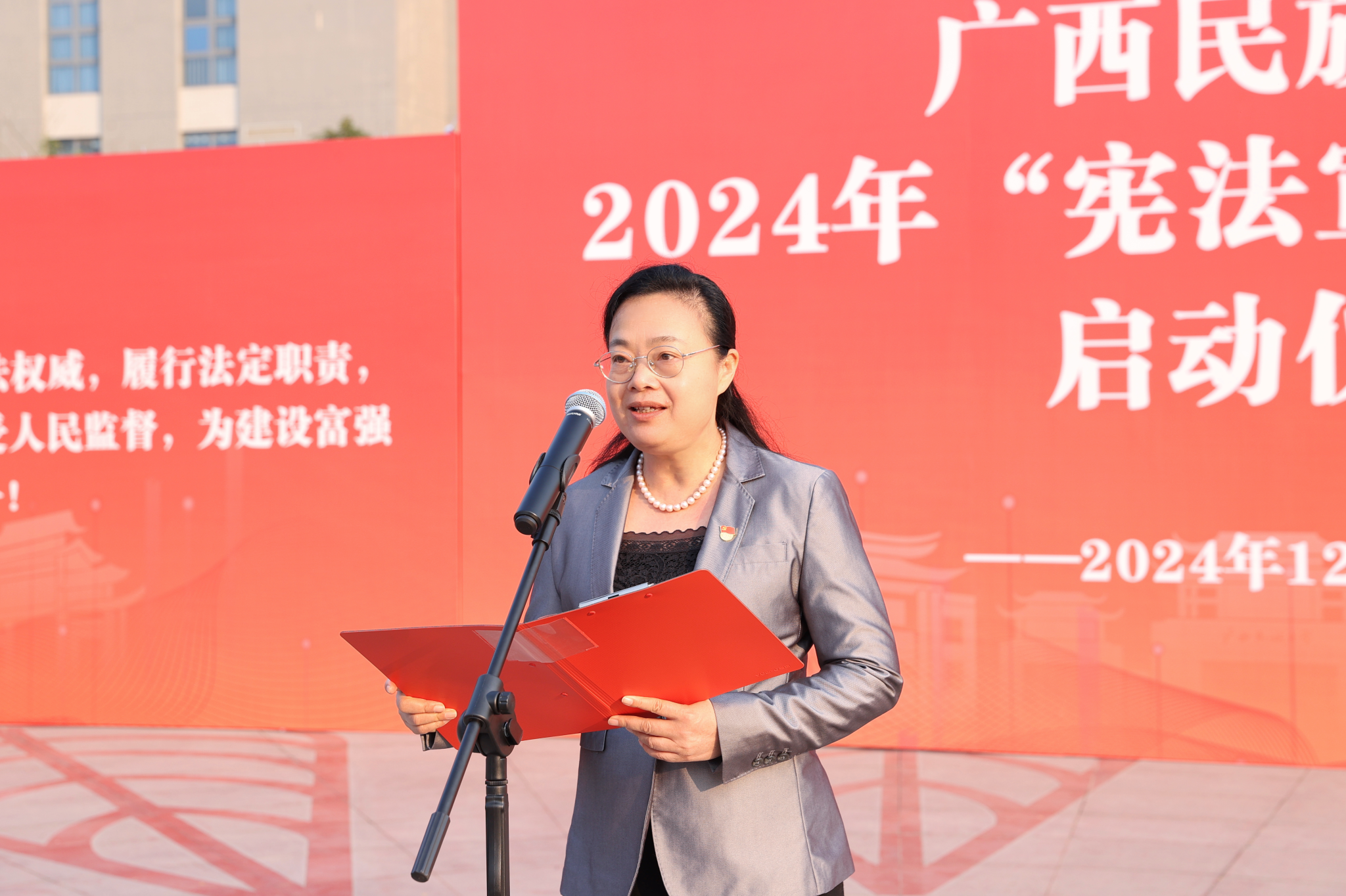 韦仕珍指出,宪法是国家的根本大法,是治国安邦的总章程。高校作为人才培养的重要阵地,肩负着为法治中国建设培育高素质法治人才的职责使命。广西民族大学高度重视法治文化建设工作,深入贯彻落实党的二十届三中全会精神,开展法律咨询服务、宪法知识素养大赛、宪法演讲比赛、法治主题书画展等形式多样的宣传教育活动,为学校法治人才培养,推进依法治校做出贡献。韦仕珍就深入学习贯彻习近平法治思想提出三点希望,一是坚持中国特色社会主义法治信仰,引导师生坚定不移走中国特色社会主义法治道路;二是推动形成宪法宣传教育合力,不断增强广大师生群众宪法意识;三是加大新媒体新技术在宪法宣传教育中的运用,推动宪法走进日常生活。