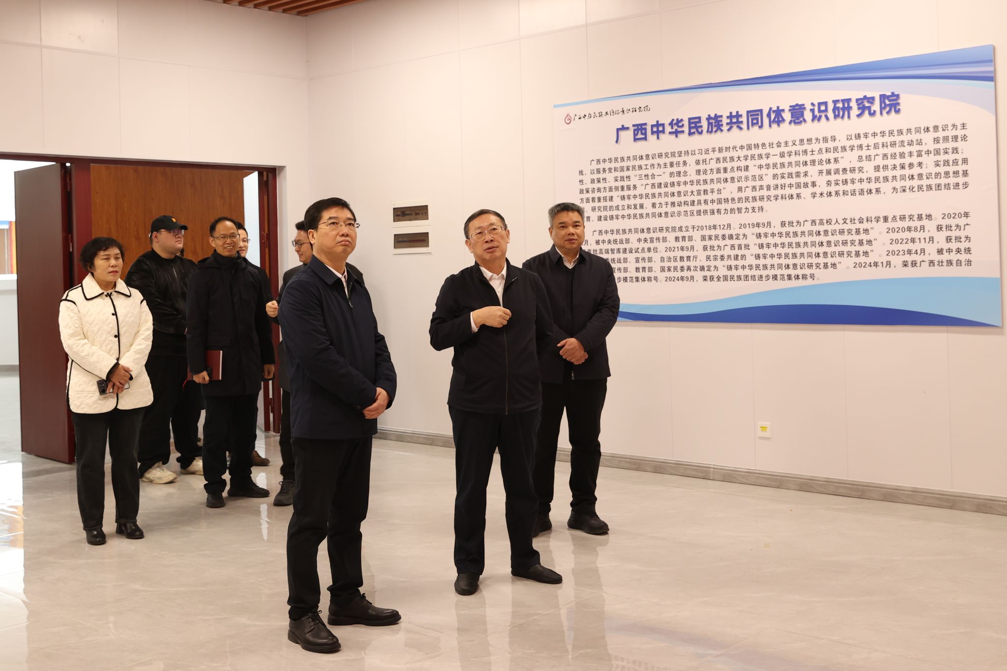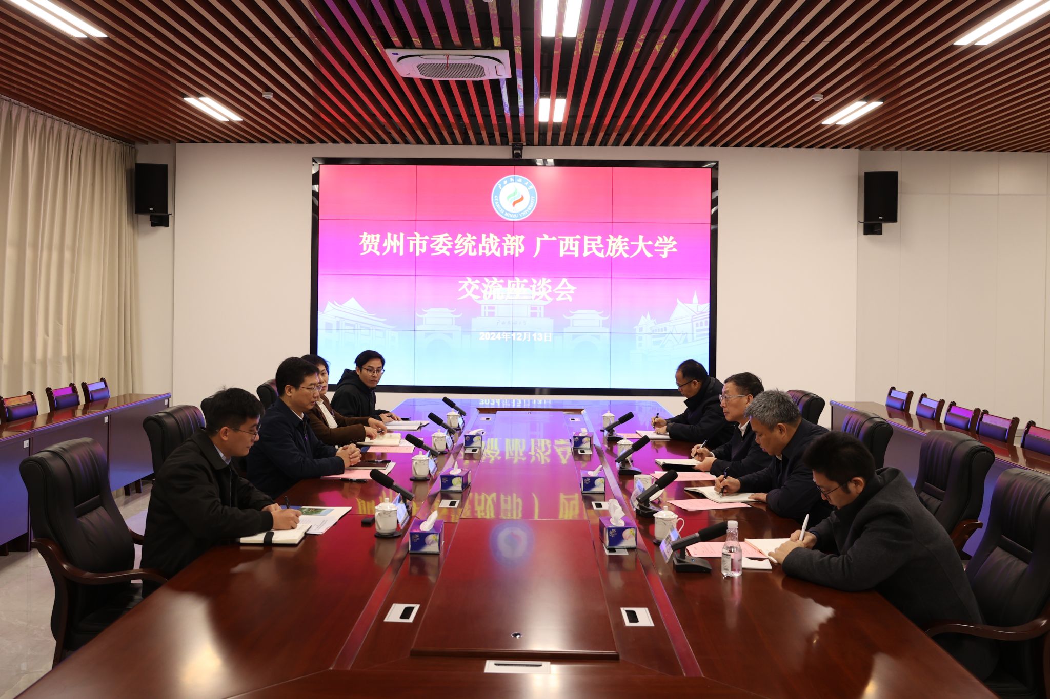 蒋晓军代表贺州市感谢广西民族大学的支持与帮助,介绍了贺州市目前发展方向,一是依托新开通的高速公路发展沿线经济,推进产业发展、助力群众增收致富;二是将农业、旅游业等特色产业发展与铸牢中华民族共同体意识工作紧密结合;三是大力发展乡村走廊,打造乡村文化,充分利用民族文化资源,助推铸牢中华民族共同体意识。蒋晓军希望双方持续加强交流合作,推动贺州市在建设铸牢中华民族共同体意识示范区上展现担当作为。