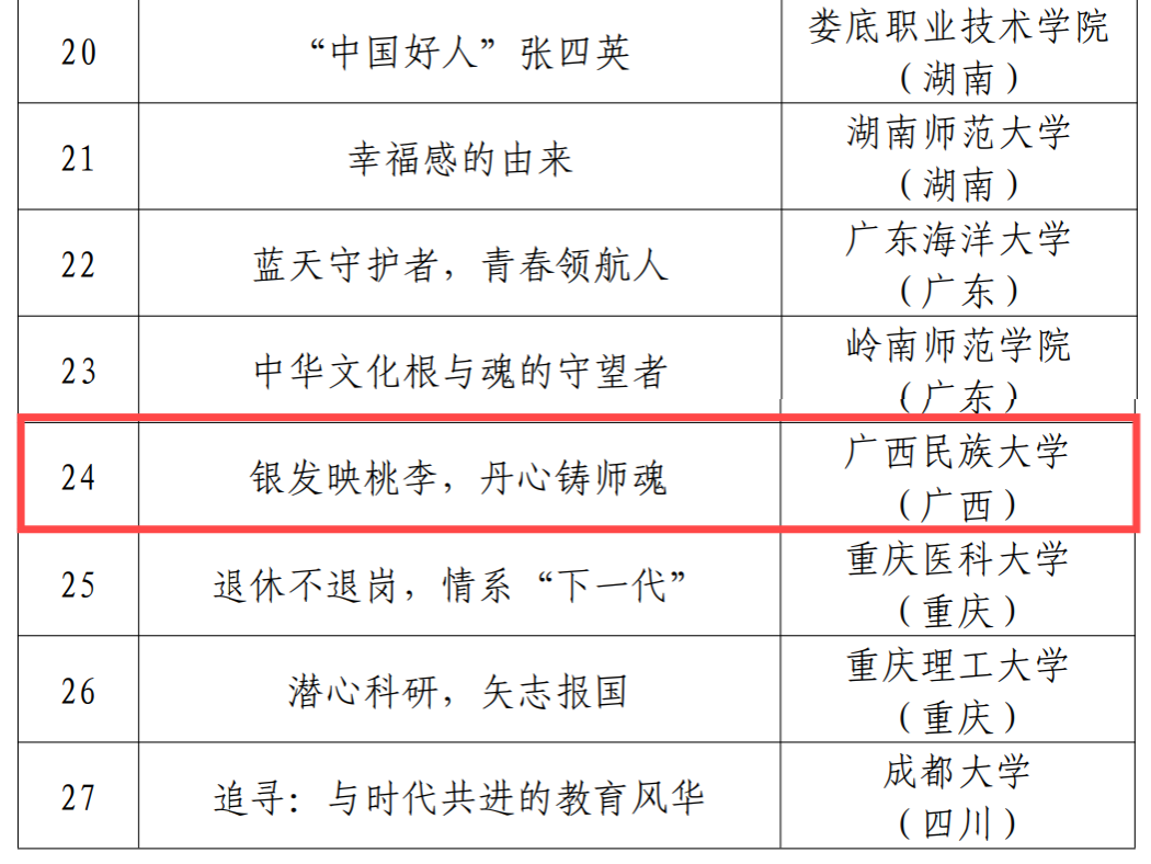 近日,教育部关工委公布2024年“读懂中国”活动入选作品名单。由广西民族大学关工委、广西民族大学融媒体中心制作的微视频《银发映桃李,丹心铸师魂》获优秀微视频奖。获奖视频讲述我校退休教师黄在银创办“乐米梦想家”工作室,以满腔的热情和负责的态度投入到科研创新中,助力学校发展和培养优秀人才。