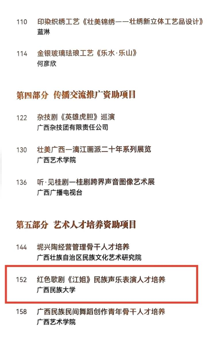 近日,广西艺术基金公布了《一般资助项目(2024年度)案例选编》,广西民族大学《红色歌剧〈江姐〉民族声乐表演人才培养》项目作为优秀案例选编入册。