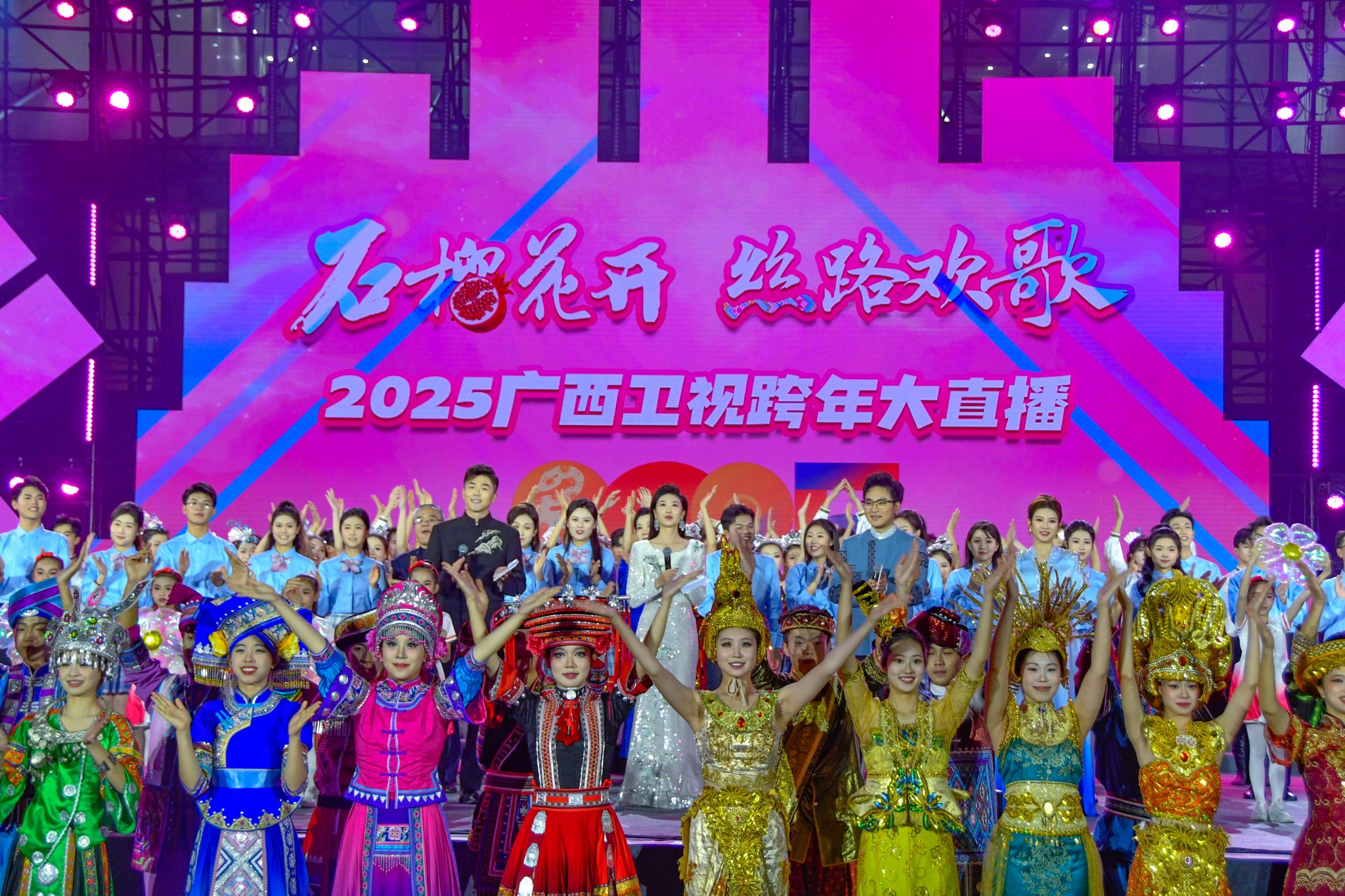 【大学生通讯社报道】12月31日晚8时,“石榴花开、丝路欢歌”2025广西卫视跨年晚会在广西民族大学思源湖校区举行。本次晚会由广西广播电视台、广西民族大学、广西壮族自治区农业农村厅联合主办。有关区直单位、主办单位领导与学校师生共同观看晚会。晚会通过广西卫视、广西民族大学视频号以及多个主流媒体和网络平台全球直播。