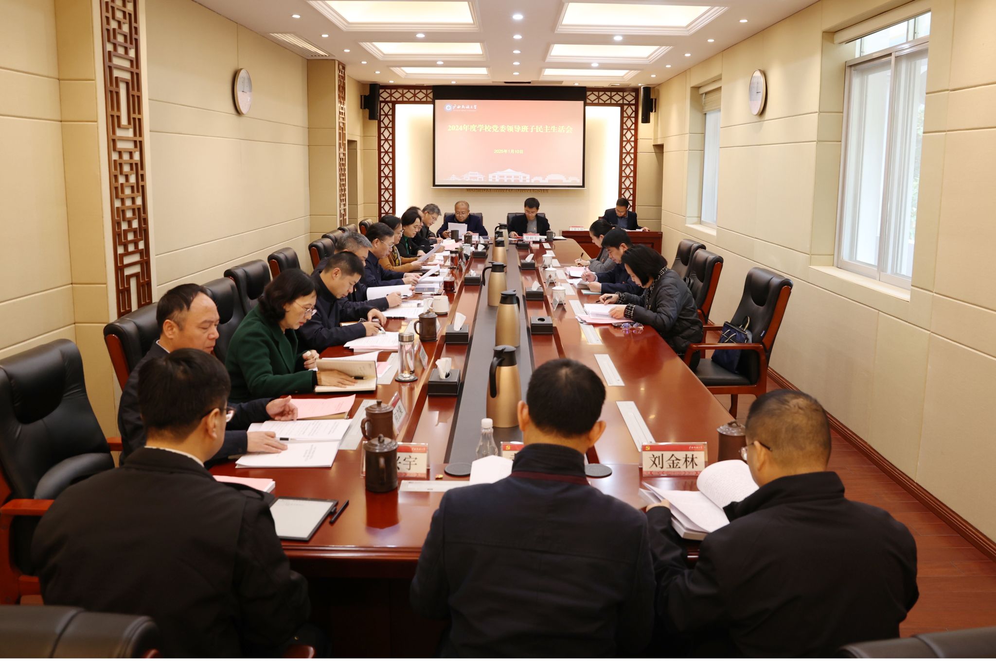 根据自治区党委的部署要求,1月10日下午,广西民族大学党委领导班子召开2024年度民主生活会。会议紧扣“深入学习贯彻习近平新时代中国特色社会主义思想,巩固深化党纪学习教育成果,综合发挥党的纪律教育约束、保障激励作用,为进一步全面深化改革、推进中国式现代化提供坚强纪律保证”主题,精心组织学习研讨,深入剖析典型案例,联系思想和工作实际,开展对照检查,进行党性分析,严肃开展批评与自我批评。学校党委书记卞成林主持会议并讲话。自治区党委教育工委专职副书记、教育厅党组成员李晓勇,自治区党委教育工委组织部部长唐春燕,自治区纪委监委第九监督检查室副主任赵庆华到会指导。