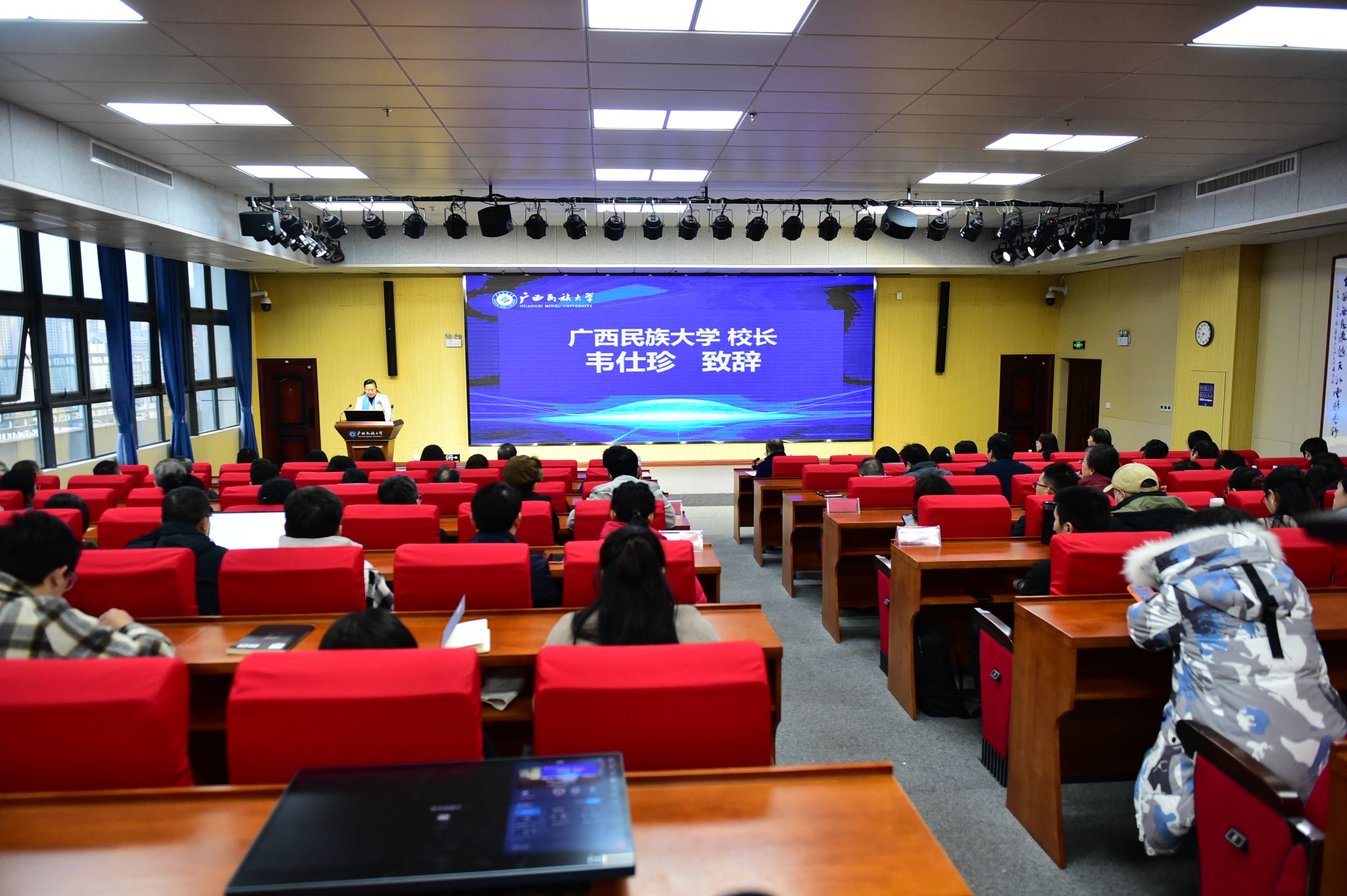 【大学生通讯社报道】1月11日上午,广西民族大学2025年教师教学创新大赛开幕式在相思湖校区图书馆学术交流厅举行。学校党委副书记、校长韦仕珍出席开幕式并致辞。学校党委常委、副校长姜明国主持开幕式。中国农业大学、中国地质大学(北京)、暨南大学等多所区内外高校专家评委,我校各学院负责人及教师代表参加开幕式。