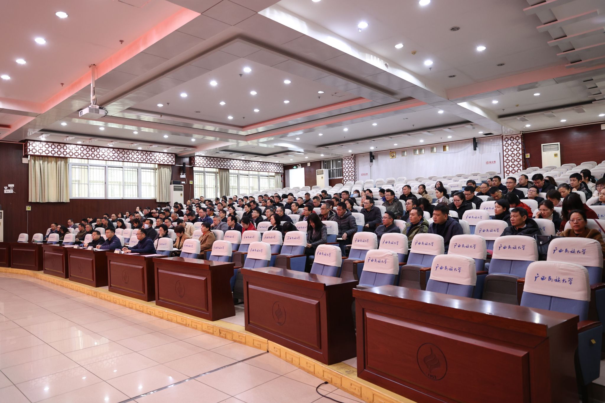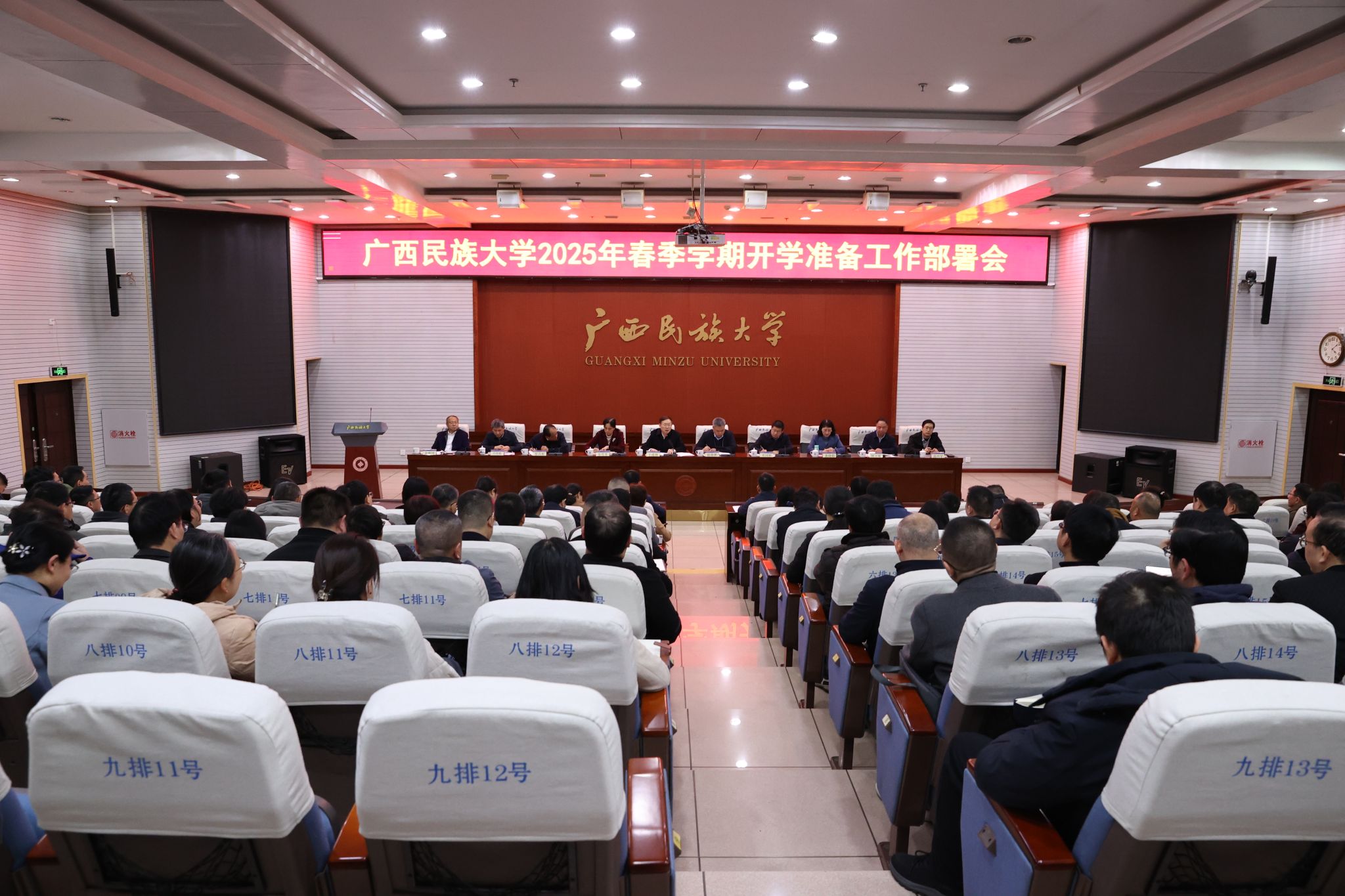 2月19日下午,广西民族大学在科技楼报告厅召开2025年春季学期开学准备工作部署会,学校党委书记卞成林出席会议并讲话,全体在家校领导及全体中层领导干部参加会议。