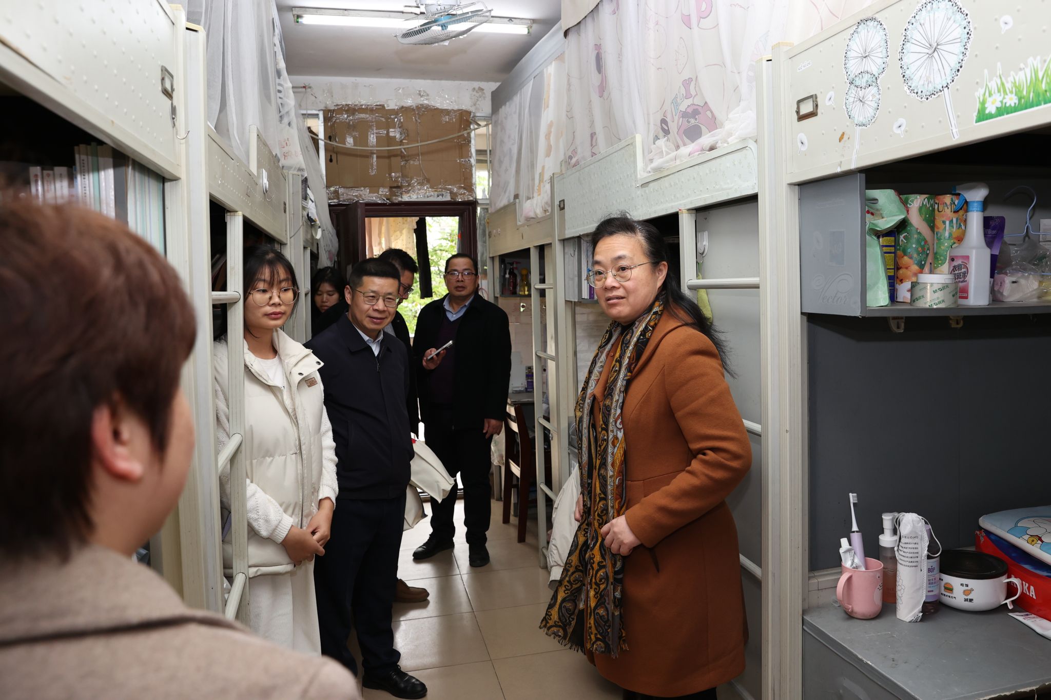 韦仕珍一行走访了四坡、五坡学生宿舍,与同学们话关切,问需求,详细询问大家的学业进展、生活情况和未来规划,重点了解学生对宿舍管理、校园服务等方面的意见建议。“最近天气变化大,要注意防寒保暖”“学习压力大的时候要多和同学、老师沟通”“生活上有困难随时向学校反映”,一句句暖心叮嘱拉近了师生距离。