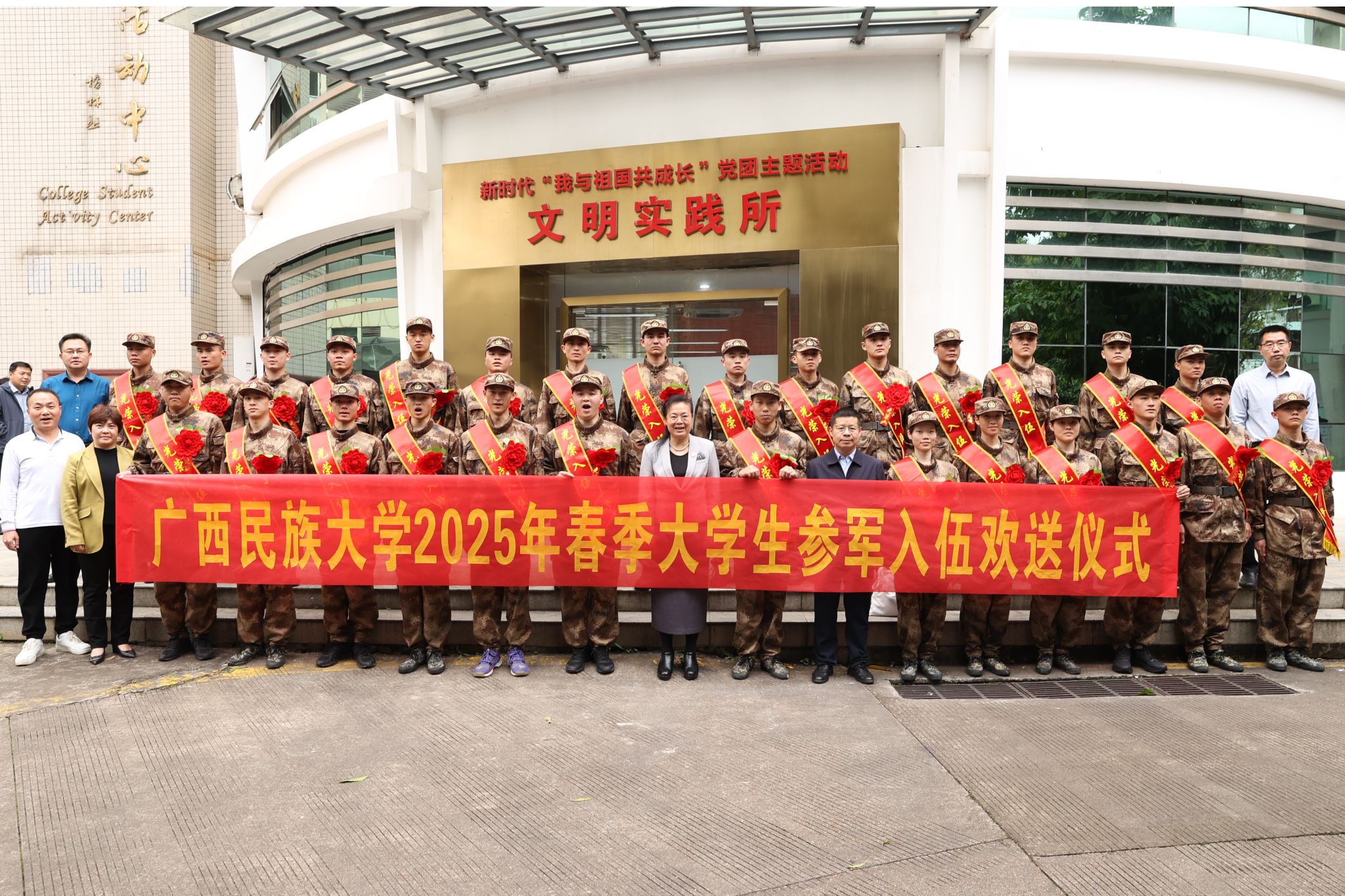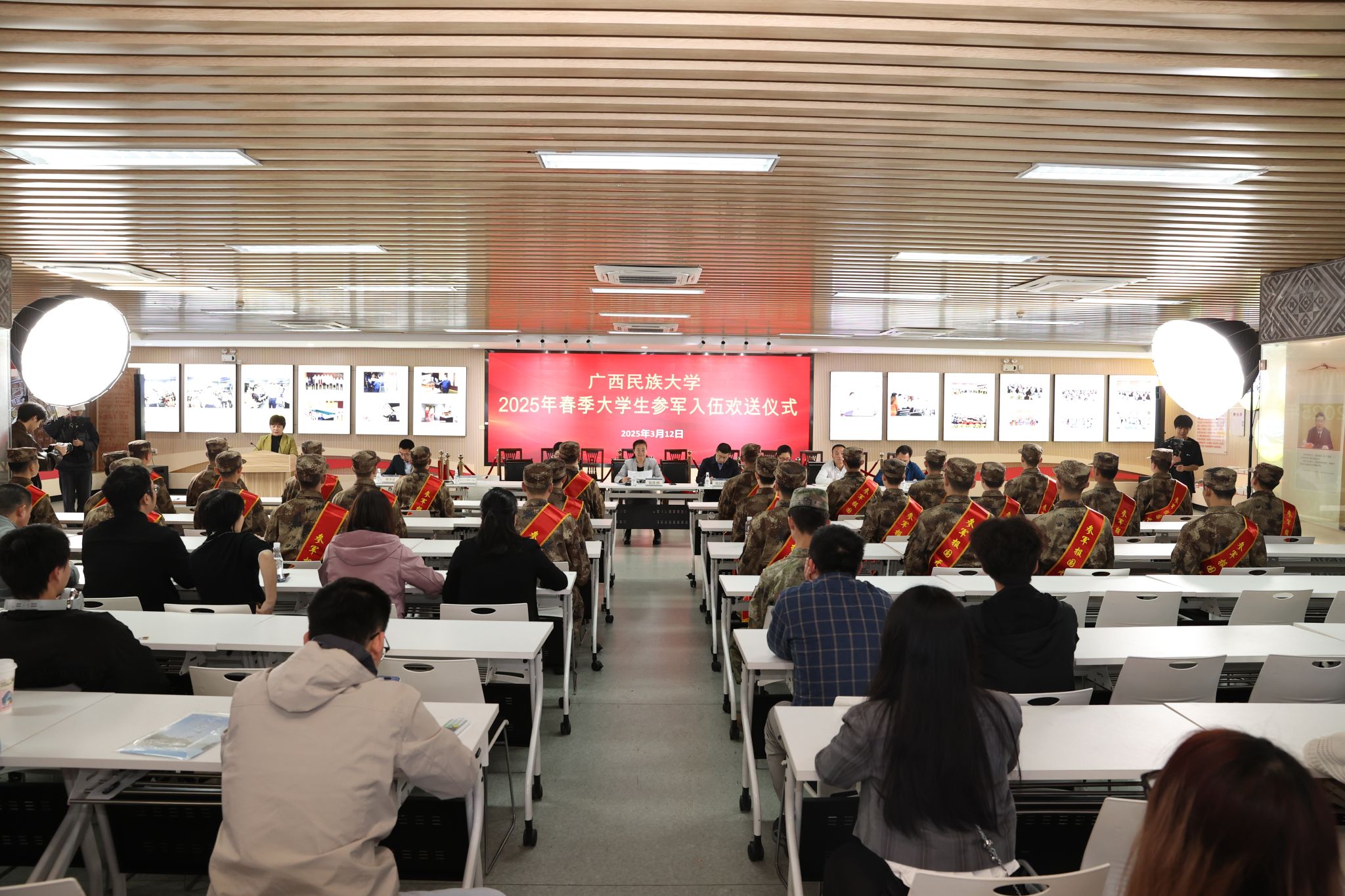 【大学生通讯社报道】3月12日下午,广西民族大学在相思湖校区大学生活动中心举行2025年春季大学生参军入伍欢送仪式,校长韦仕珍出席欢送仪式并讲话,党委副书记邓国彬主持。2025年春季我校共有28名学生参军入伍。