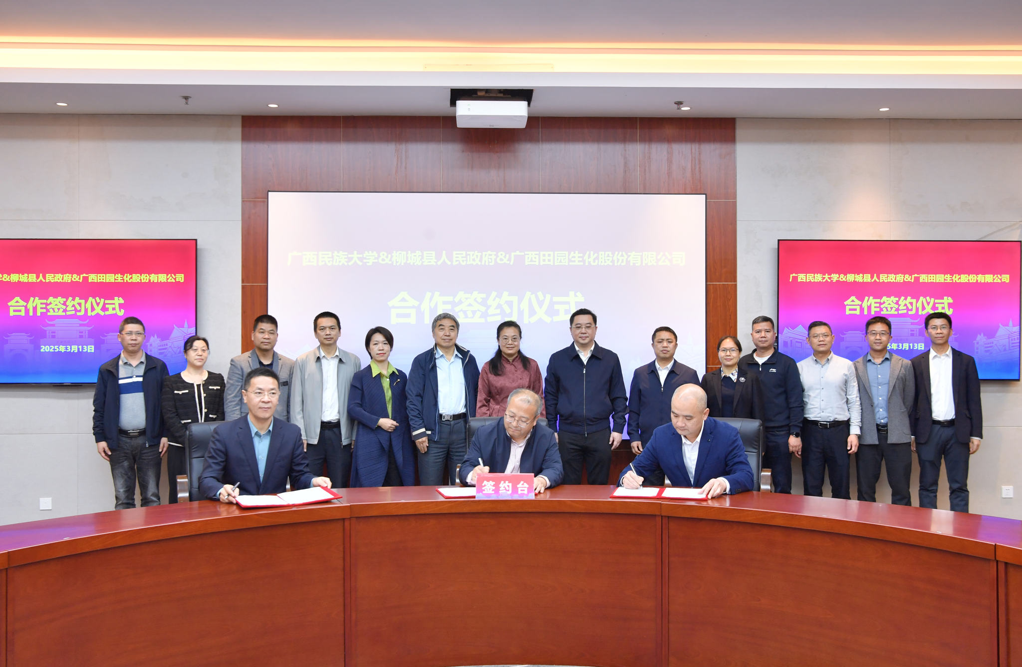 【大学生通讯社报道】3月13日下午,广西民族大学与柳城县人民政府、广西田园生化股份有限公司在学校文化研习基地签订战略合作协议。校长韦仕珍,柳城县委书记李柳彬,广西田园生化股份有限公司党委书记、董事长李卫国出席签约仪式并致辞。副校长姜明国主持仪式。