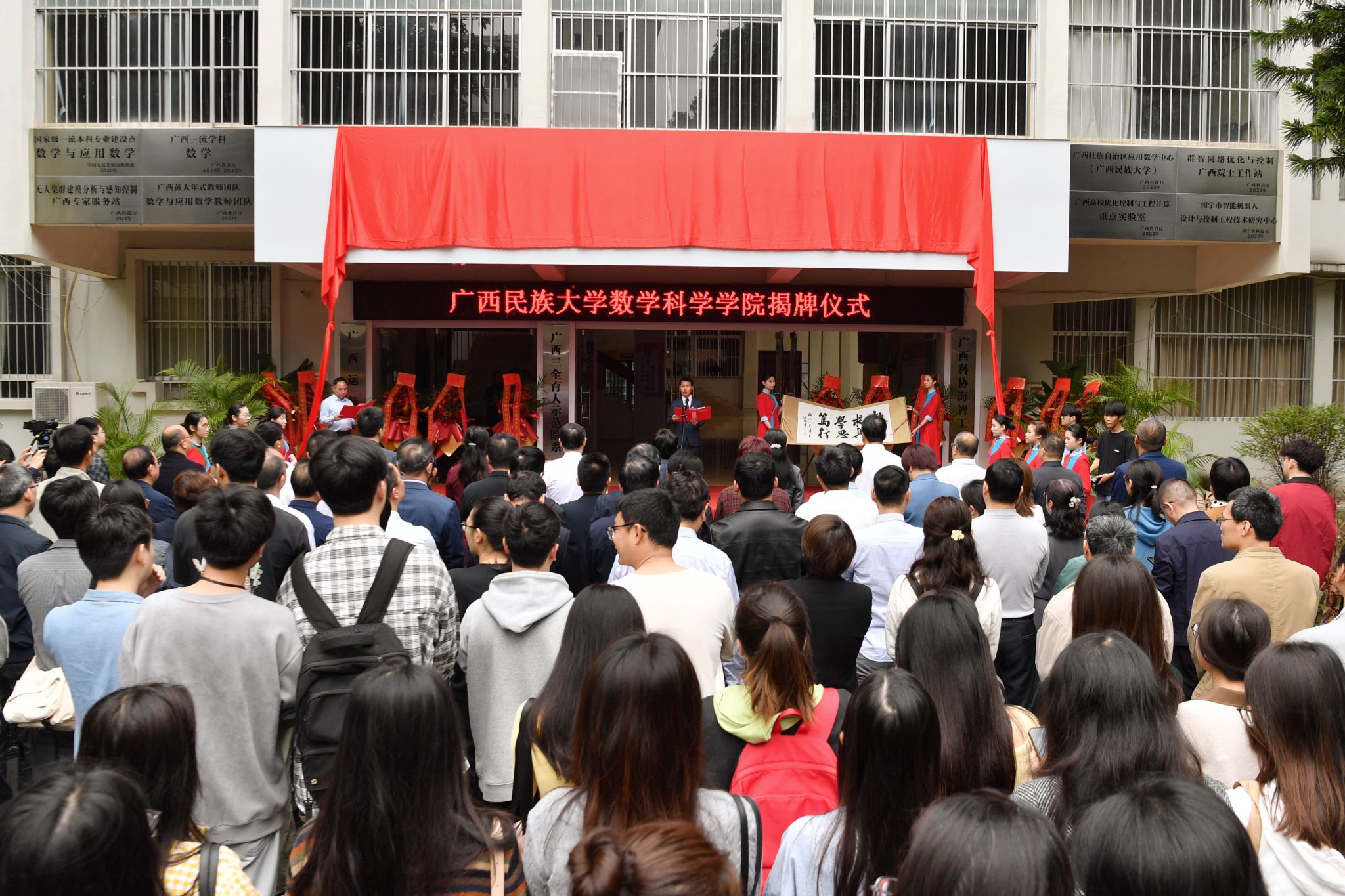 【大学生通讯社报道】3月14日上午,广西民族大学数学科学学院揭牌仪式在创新楼举行。学校党委书记卞成林,校长韦仕珍出席揭牌仪式。全体在家校领导,知名数学家,广西数学会代表,各学院和职能部门负责人及数学科学学院退休教师代表、校友代表、合作单位代表、师生代表参加揭牌仪式。副校长何立荣主持揭牌仪式。