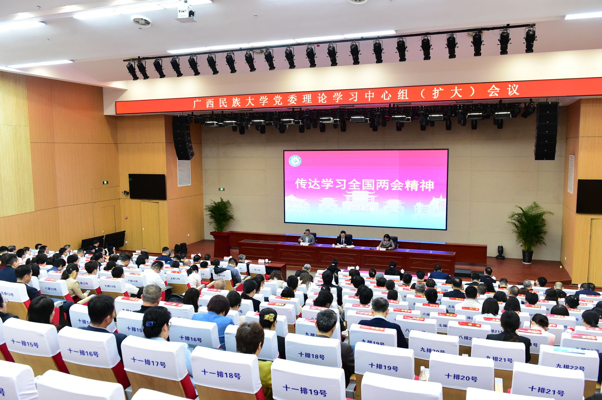 3月15日下午,广西民族大学召开党委理论学习中心组(扩大)学习会,传达学习十四届全国人大三次会议、全国政协十四届三次会议精神。校党委书记卞成林主持会议并传达全区传达贯彻全国两会精神大会精神。全国政协委员、民进广西区委副主委、副校长黄晓娟,全国人大代表、自治区文联主席、广西民族大学文学影视创作中心主任田代琳教授分别传达全国两会精神。