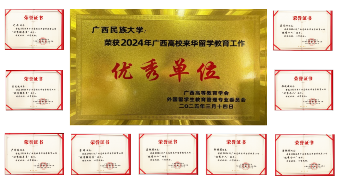 近日,广西高等教育学会外国留学生教育管理专业委员会2024年年会暨表彰大会在桂林召开,大会对2024年广西来华留学教育优秀单位及优秀个人进行表彰,广西民族大学荣获2024年广西高校来华留学教育“优秀单位”称号,这是我校2018年以来连续7年获此荣誉。我校陈思敏等4名教师荣获“优秀辅导员”称号,莫育珍等5名教师荣获“优秀个人”称号。