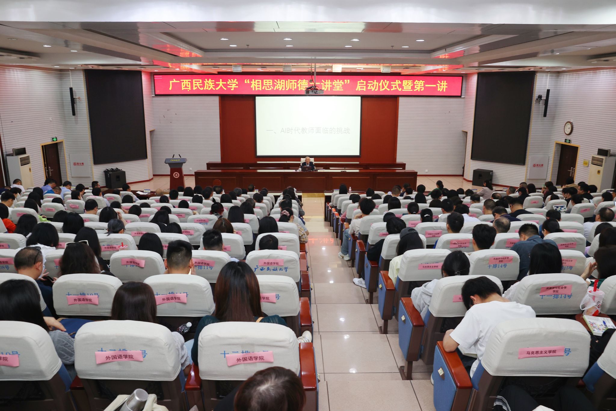 【大学生通讯社报道】3月25日下午,广西民族大学“相思湖师德大讲堂”启动仪式暨第一讲在科技楼报告厅举行。校长韦仕珍出席启动仪式并致辞,副校长蔡高根主持活动,华东师范大学首批终身教授陈玉琨作题为“AI时代高校师德师风建设”的讲座。