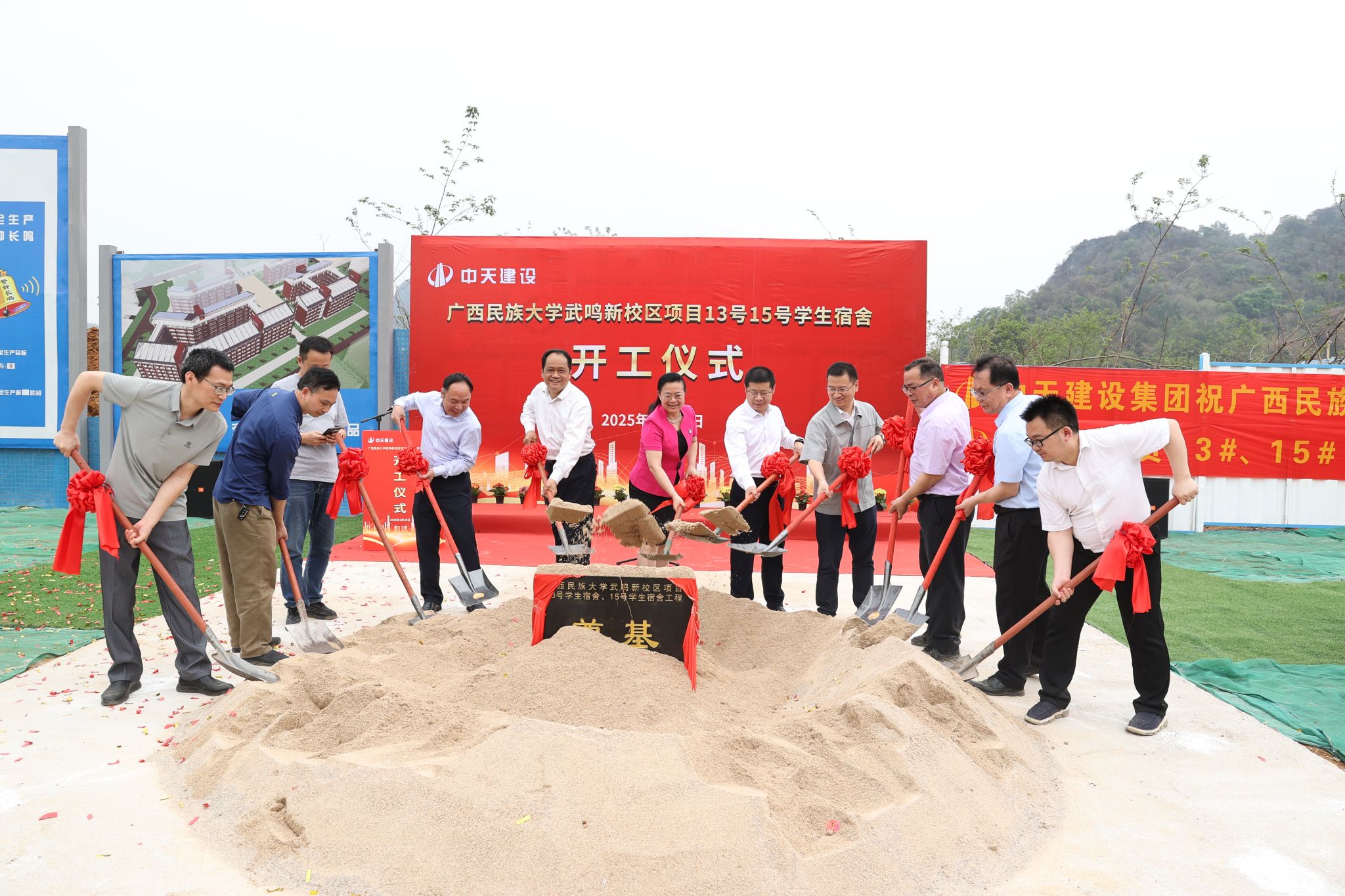 3月28日上午,广西民族大学在武鸣校区举行13、15号学生宿舍开工仪式。校长韦仕珍,党委副书记邓国彬,副校长蔡高根、何立荣共同为项目培土奠基。开工仪式由蔡高根主持。