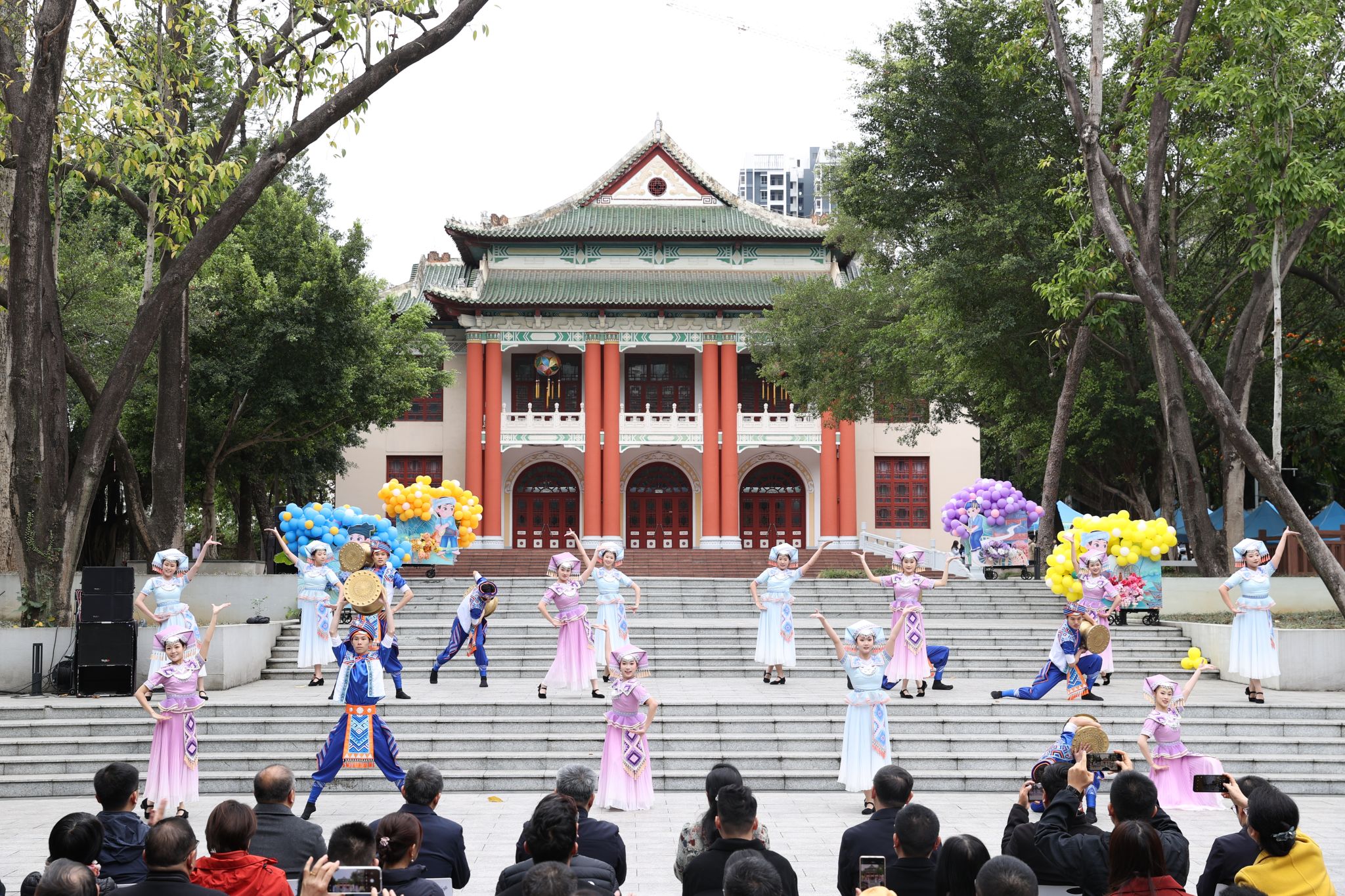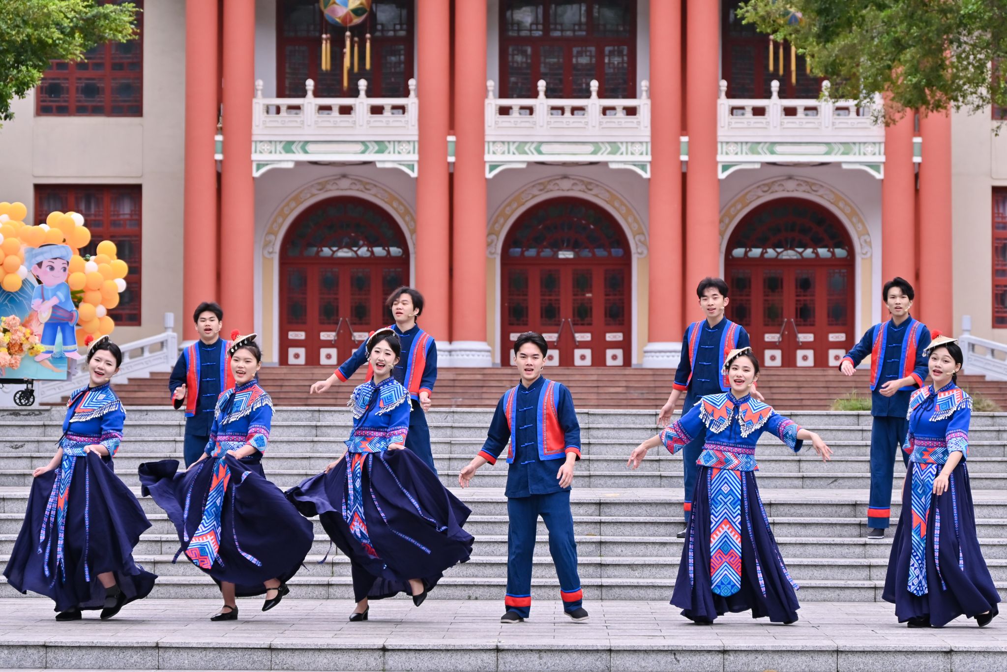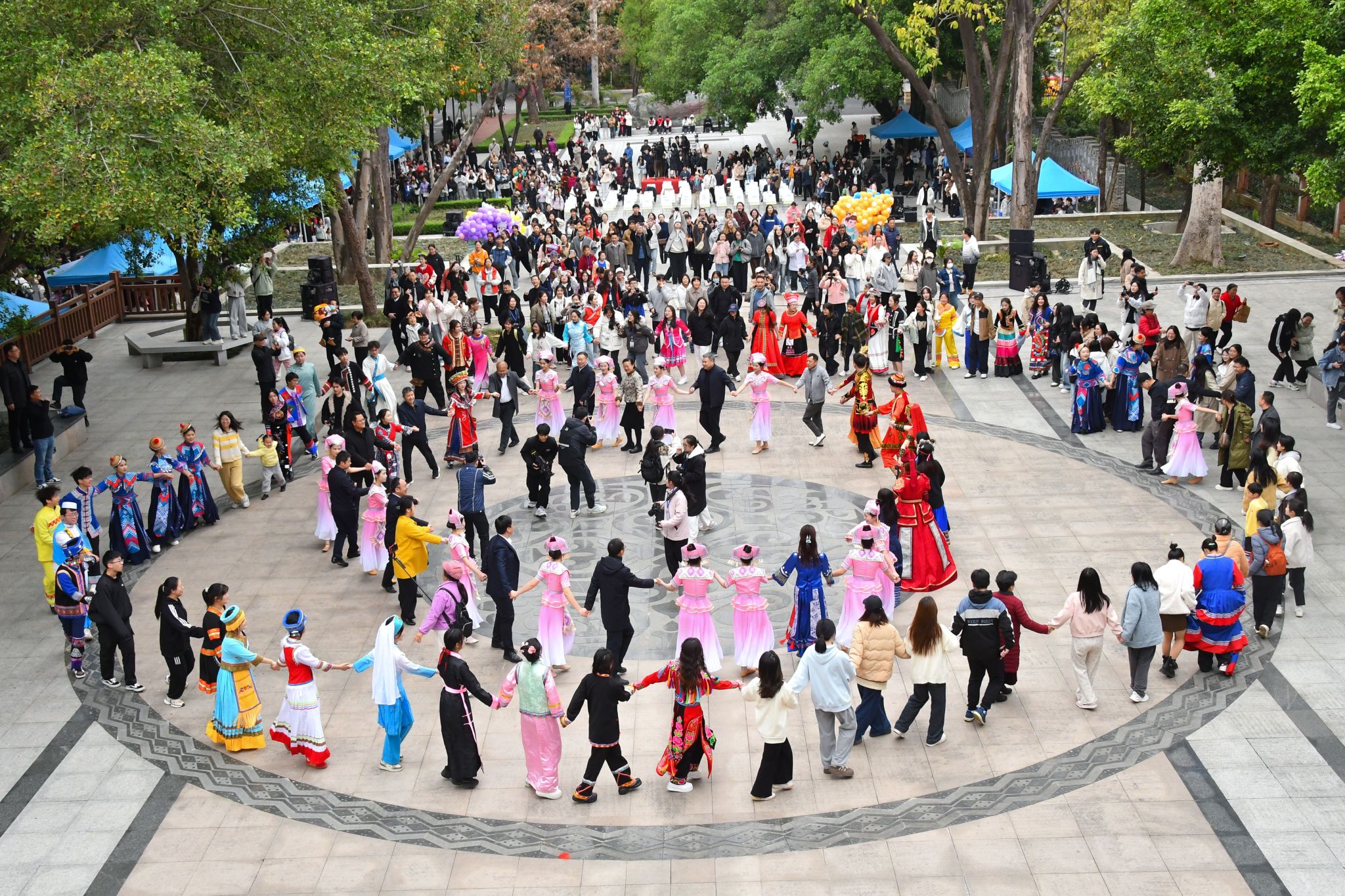 《爱我中华》的歌声响起,台下嘉宾和师生移步至广场中央,手拉着手共跳《圆圈舞》,现场气氛欢快热烈,呈现出中华民族一家亲的和谐美好。