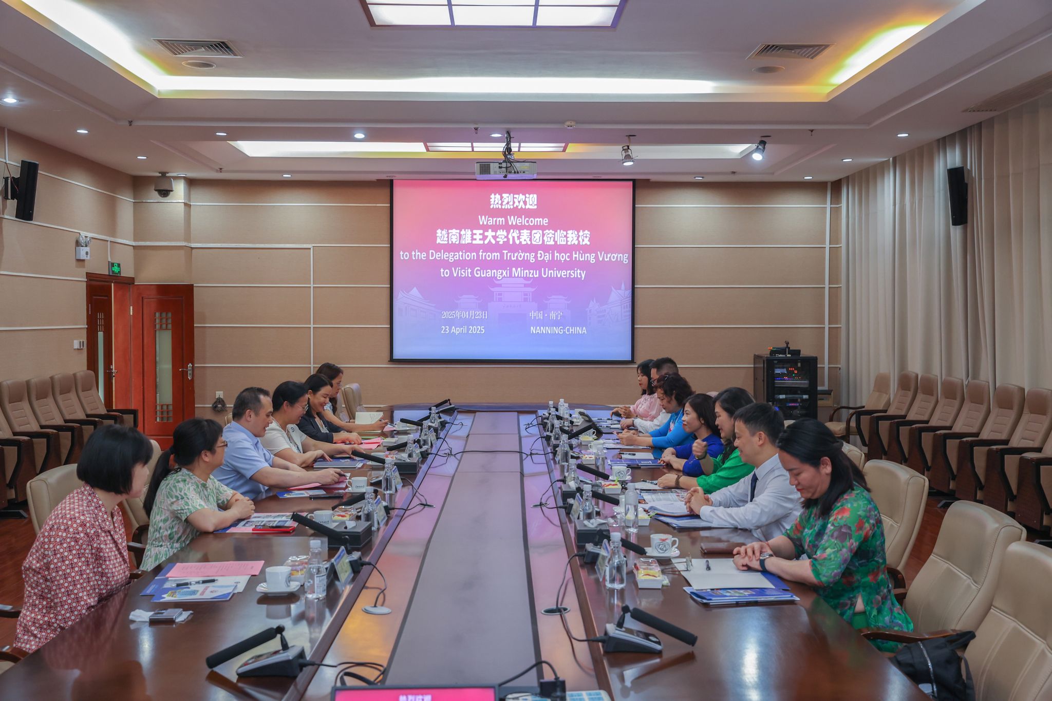 【大学生通讯社报道】4月23日上午,广西民族大学校长韦仕珍会见来访的越南雄王大学副校长潘氏情一行,双方在国际教育综合楼一楼会议室举行座谈会。